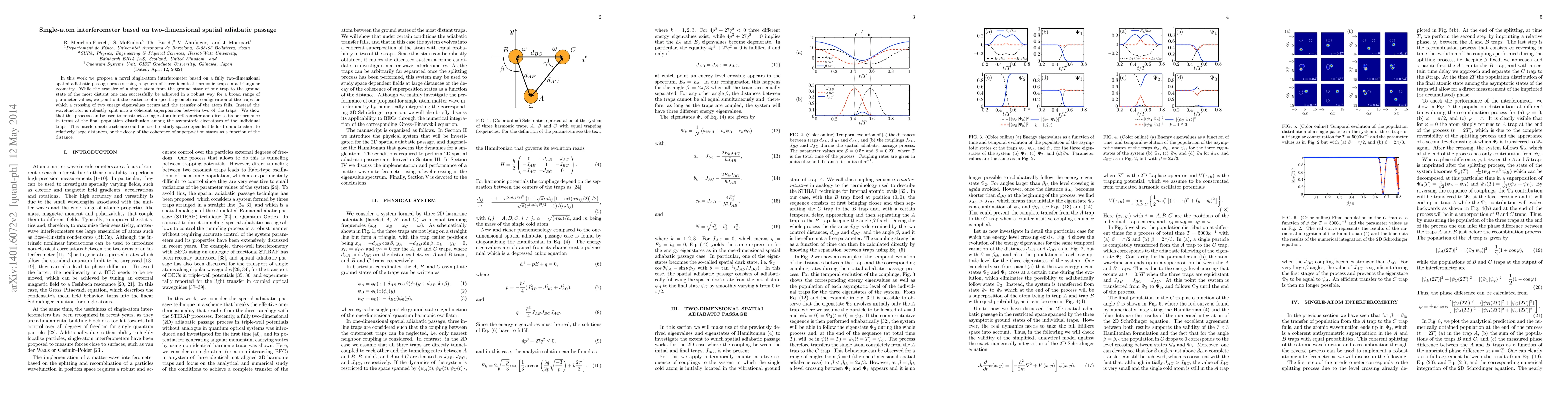 In this work we propose a novel single-atom interferometer based on a fully two-dimensional spatial adiabatic passage process using a system of three identical harmonic traps in a triangular geometry. While the transfer of a single atom from the ground state of one trap to the ground state of the most distant one can successfully be achieved in a robust way for a broad range of parameter values, we point out the existence of a specific geometrical configuration of the traps for which a crossing of two energy eigenvalues occurs and the transfer of the atom fails. Instead the wavefunction is robustly split into a coherent superposition between two of the traps. We show that this process can be used to construct a single-atom interferometer and discuss its performance in terms of the final population distribution among the asymptotic eigenstates of the individual traps. This interferometric scheme could be used to study space dependent fields from ultrashort to relatively large distances, or the decay of the coherence of superposition states as a function of the distance.