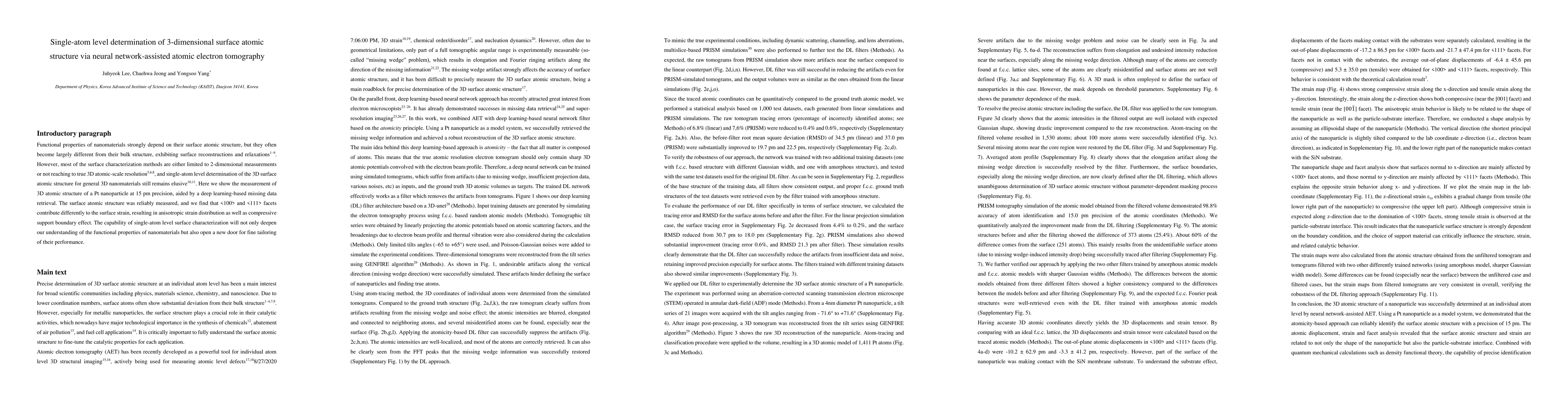 This paper presents a novel method using neural networks to achieve single-atom level 3D surface atomic structure determination for nanomaterials, demonstrating 15 pm precision in Pt nanoparticle analysis. The findings reveal anisotropic strain distribution due to different contributions from <100> and <111> facets, highlighting the potential for advanced nanomaterial performance tailoring.