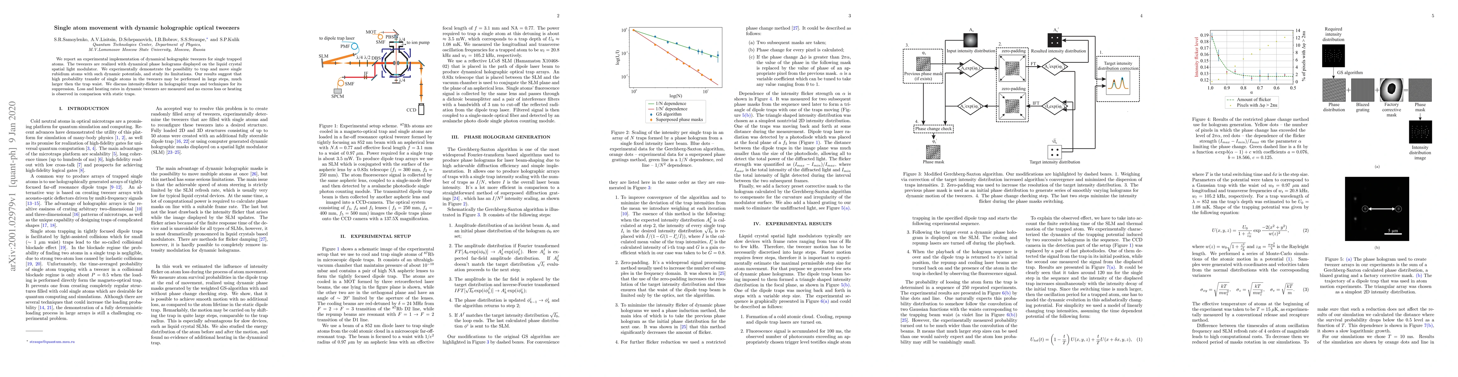 This paper demonstrates the use of dynamic holographic optical tweezers to trap and move single rubidium atoms, showing high probability transfer over large distances without excess loss or heating compared to static traps, while also addressing techniques for suppressing intensity-flicker.