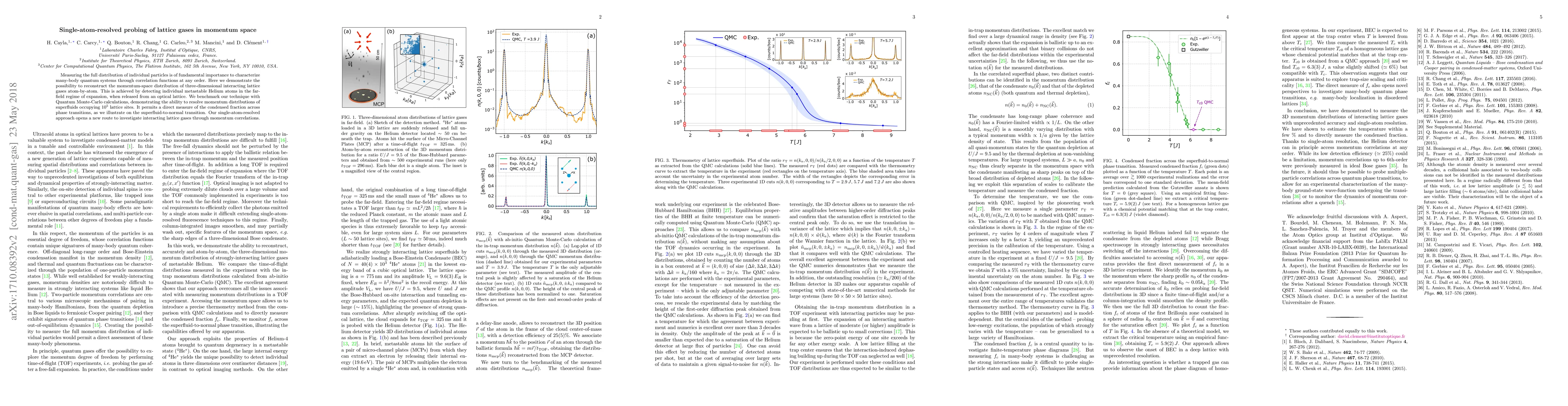 This research presents a method to map the momentum-space distribution of 3D interacting lattice gases atom-by-atom by detecting individual metastable Helium atoms post-release from an optical lattice. The technique, verified through Quantum Monte-Carlo calculations, resolves distributions for systems with up to $10^5$ lattice sites, enabling direct measurement of condensed fractions across phase transitions, as demonstrated on the superfluid-to-normal transition. This single-atom resolution paves the way for new investigations into interacting lattice gases via momentum correlations.