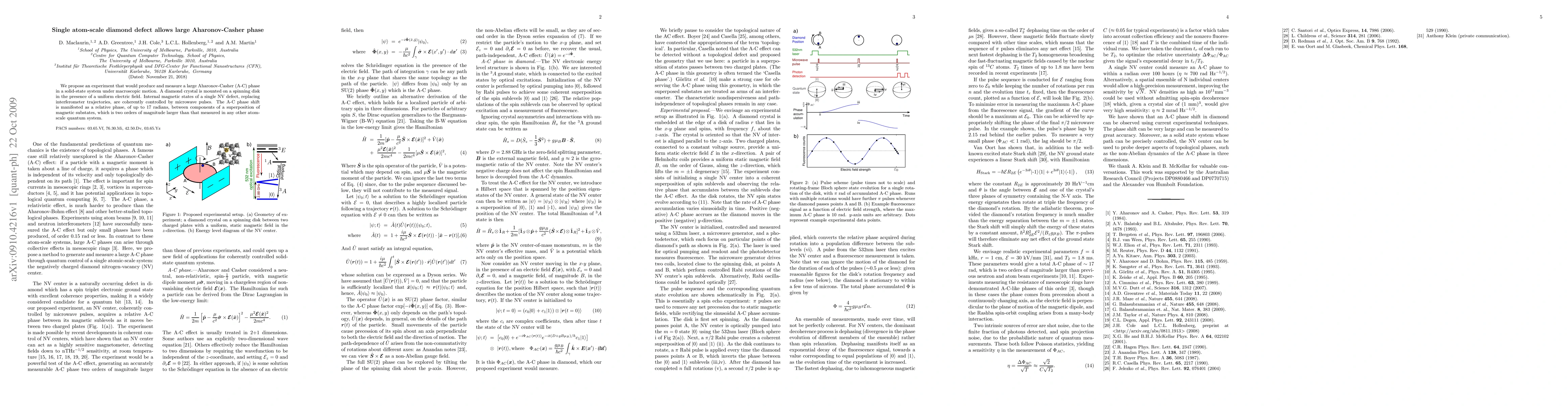 This paper proposes an experiment to generate a large Aharonov-Casher phase in a diamond crystal with an NV defect, using a spinning disk and microwave pulses to control magnetic states. The experiment demonstrates a phase shift up to 17 radians, significantly larger than previously observed in other quantum systems.