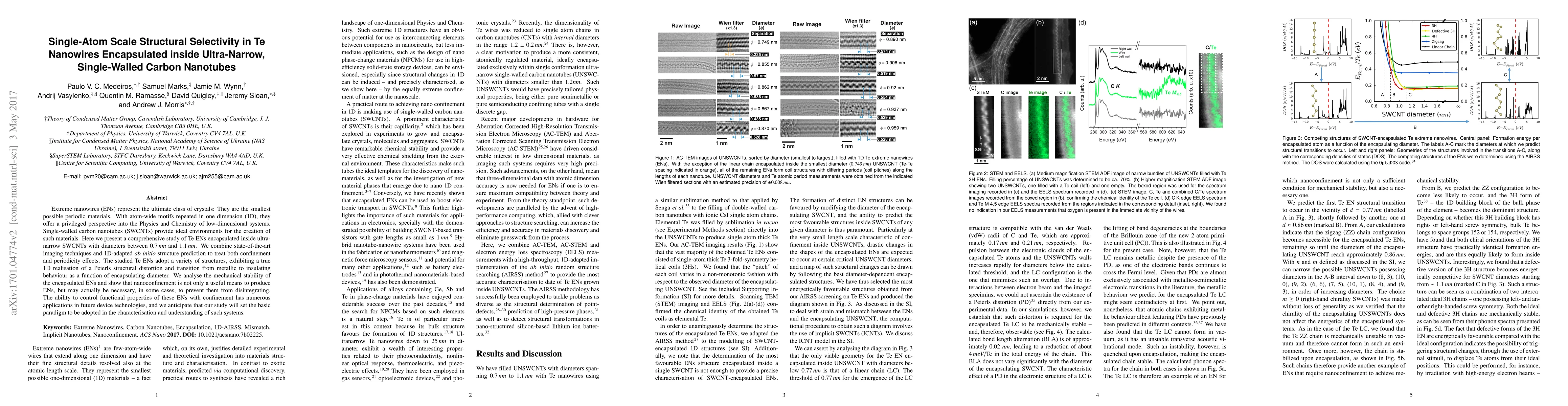 This study explores Extreme Nanowires (ENs) of Tellurium encapsulated in ultra-narrow Single-Walled Carbon Nanotubes (SWCNTs). Using advanced imaging techniques and ab initio structure prediction, researchers discovered that Te ENs can adopt various structures, showing a Peierls distortion and transitioning from metallic to insulating behavior based on the SWCNT diameter. The findings suggest that nanoconfinement can stabilize these ENs, with potential applications in future device technologies.