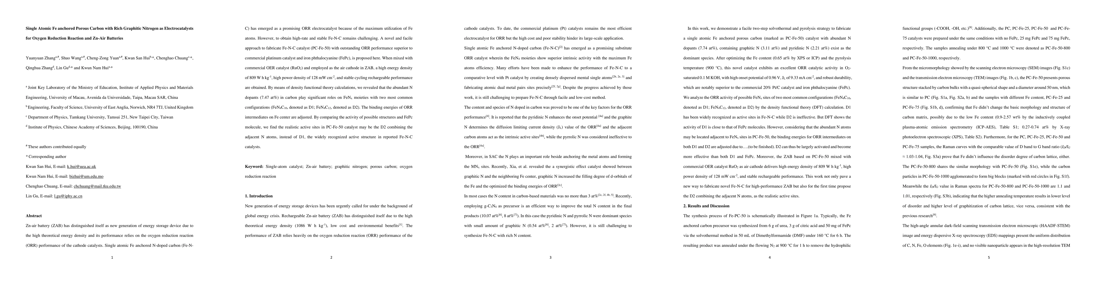 This paper proposes a novel Fe-N-C catalyst with rich graphitic nitrogen for the oxygen reduction reaction (ORR) in Zn-air batteries, achieving superior performance to commercial platinum and iron phthalocyanine. The catalyst, PC-Fe-50, demonstrates high energy density, power density, and stable cycling, with DFT calculations suggesting the D2 FeN4C12 configuration as the likely active site.