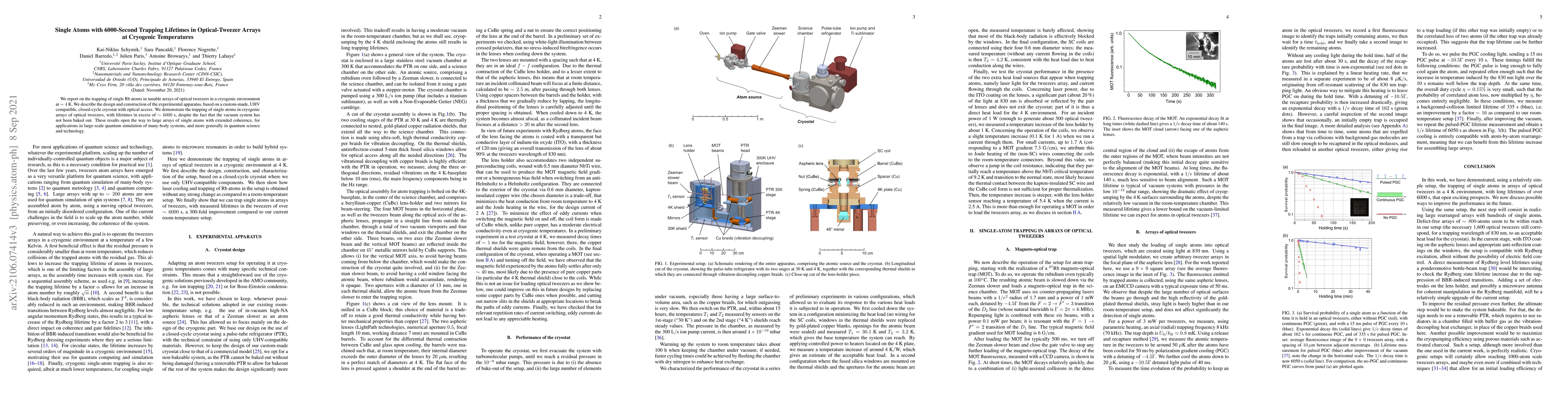 This research reports the successful trapping of single rubidium atoms in cryogenic optical-tweezer arrays at approximately 4 K, achieving trapping lifetimes exceeding 6000 seconds. The experiment utilizes a custom UHV-compatible cryostat, paving the way for quantum simulation applications.