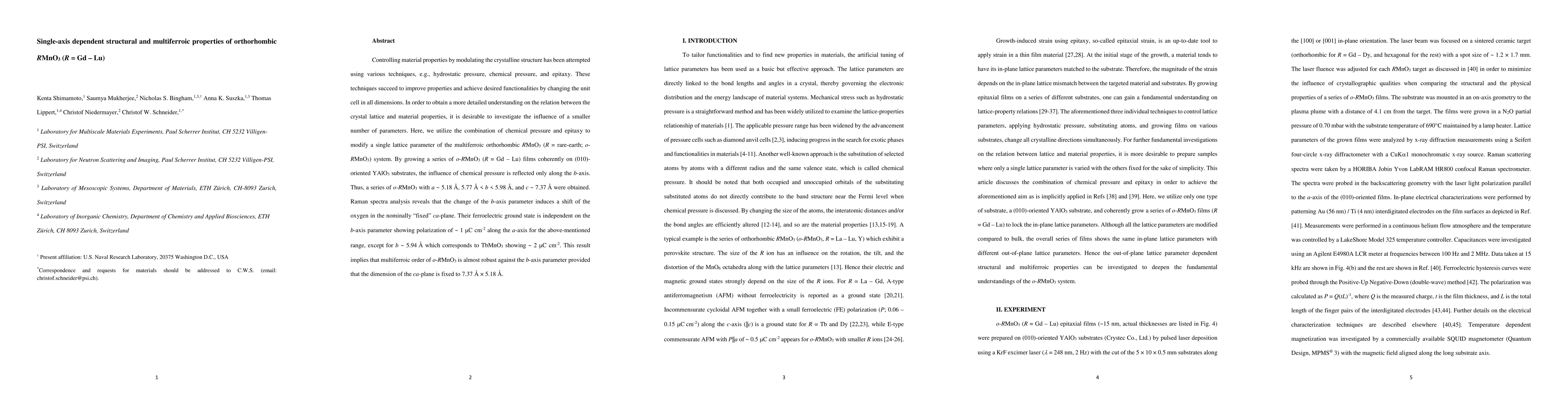 Controlling material properties by modulating the crystalline structure has been attempted using various techniques, e.g., hydrostatic pressure, chemical pressure, and epitaxy. These techniques succeed to improve properties and achieve desired functionalities by changing the unit cell in all dimensions. In order to obtain a more detailed understanding on the relation between the crystal lattice and material properties, it is desirable to investigate the influence of a smaller number of parameters. Here, we utilize the combination of chemical pressure and epitaxy to modify a single lattice parameter of the multiferroic orthorhombic RMnO$_3$ (R = rare-earth, o-RMnO$_3$) system. By growing a series of o-RMnO$_3$ (R = Gd - Lu) films coherently on (010)-oriented YAlO$_3$ substrates, the influence of chemical pressure is reflected only along the $b$-axis. Thus, a series of o-RMnO$_3$ with $a$ ~ 5.18 {\AA}, 5.77 {\AA} < $b$ < 5.98 {\AA}, and $c$ ~ 7.37 {\AA} were obtained. Raman spectra analysis reveals that the change of the $b$-axis parameter induces a shift of the oxygen in the nominally "fixed" $ca$-plane. Their ferroelectric ground state is independent on the $b$-axis parameter showing polarization of ~ 1 $\mu$C cm$^{-2}$ along the $a$-axis for the above-mentioned range, except for $b$ ~ 5.94 {\AA} which corresponds to TbMnO$_3$ showing ~ 2 $\mu$C cm$^{-2}$. This result implies that multiferroic order of o-RMnO$_3$ is almost robust against the $b$-axis parameter provided that the dimension of the $ca$-plane is fixed to 7.37 {\AA} $\times$ 5.18 {\AA}.
