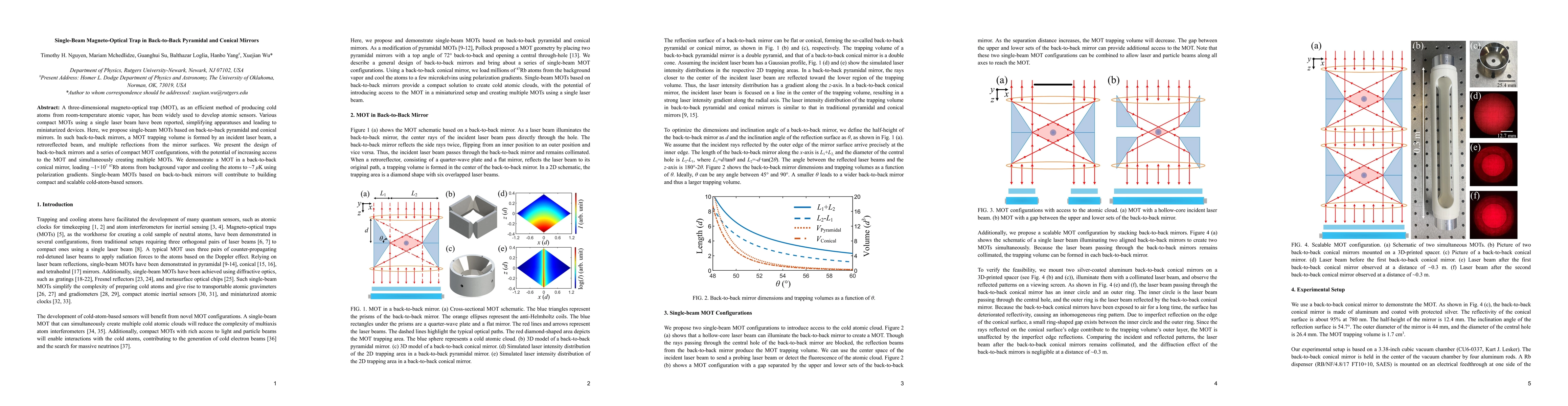 A three-dimensional magneto-optical trap (MOT), as an efficient method of producing cold atoms from room-temperature atomic vapor, has been widely used to develop atomic sensors. Various compact MOTs using a single laser beam have been reported, simplifying apparatuses and leading to miniaturized devices. Here, we propose single-beam MOTs based on back-to-back pyramidal and conical mirrors. In such back-to-back mirrors, a MOT trapping volume is formed by an incident laser beam, a retroreflected beam, and multiple reflections from the mirror surfaces. We present the design of back-to-back mirrors and a series of compact MOT configurations, with the potential of increasing access to the MOT and simultaneously creating multiple MOTs. We demonstrate a MOT in a back-to-back conical mirror, loading 10 million rubidium-87 atoms from background vapor and cooling the atoms to 7 {\mu}K using polarization gradients. Single-beam MOTs based on back-to-back mirrors will contribute to building compact and scalable cold-atom-based sensors.