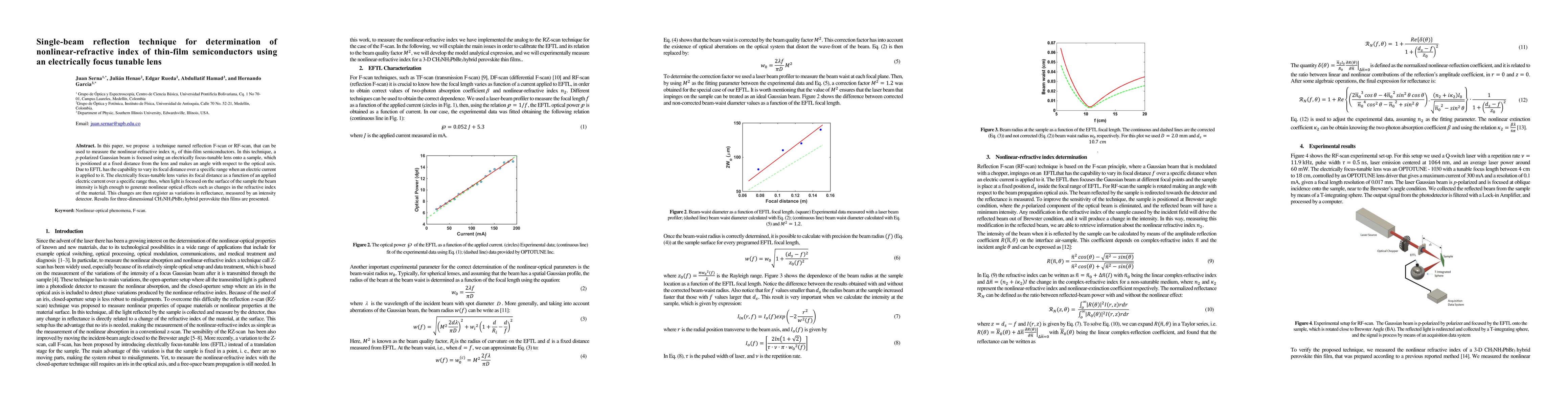 In this paper, we propose a technique named reflection F-scan or RF-scan, that can be used to measure the nonlinear-refractive index n_2 of thin-film semiconductors. In this technique, a p-polarized Gaussian beam is focused using an electrically focus-tunable lens onto a sample, which is positioned at a fixed distance from the lens and makes an angle with respect to the optical axis. Due to EFTL has the capability to vary its focal distance over a specific range when an electric current is applied to it. The electrically focus-tunable lens varies its focal distance as a function of an applied electric current over a specific range thus, when light is focused on the surface of the sample the beam intensity is high enough to generate nonlinear optical effects such as changes in the refractive index of the material. This changes are then register as variations in reflectance, measured by an intensity detector. Results for three-dimensional CH3NH3PbBr3 hybrid perovskite thin films are presented.