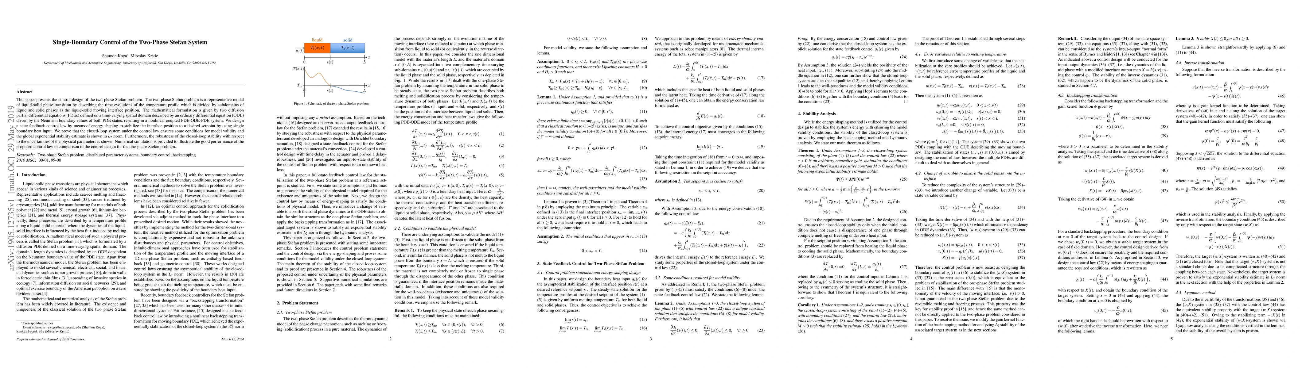 This paper designs a state feedback control law for the two-phase Stefan problem to stabilize the liquid-solid interface using single boundary heat input, proving global exponential stability and robustness against parameter uncertainties, and demonstrating superior performance via numerical simulations.