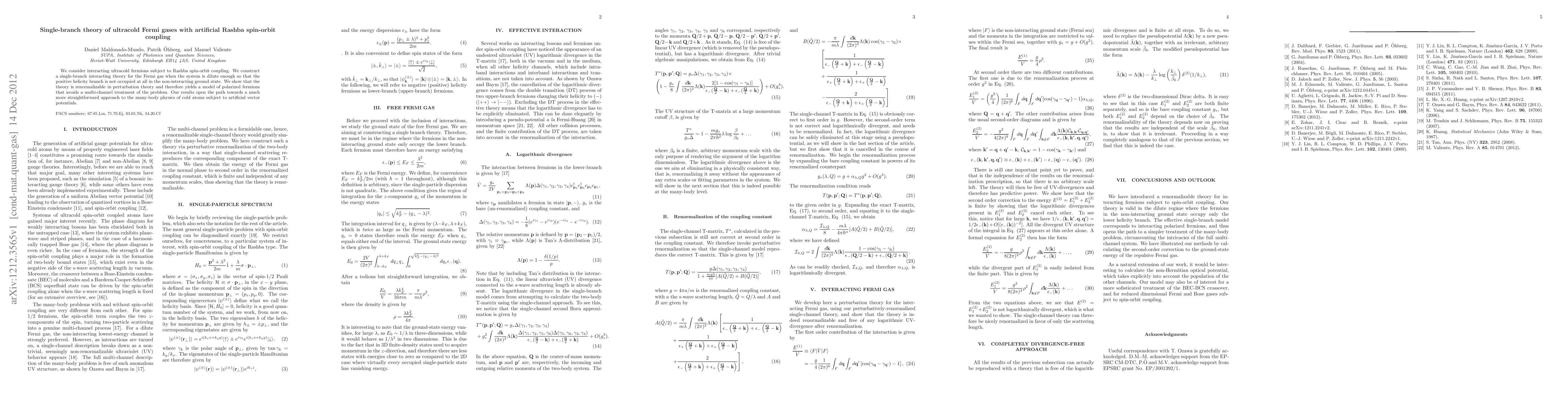 The research presents a simplified, single-branch theory for interacting ultracold fermions with Rashba spin-orbit coupling. It demonstrates the theory's renormalizability in perturbation theory, providing a more accessible approach to studying the many-body physics of cold atoms under artificial vector potentials.