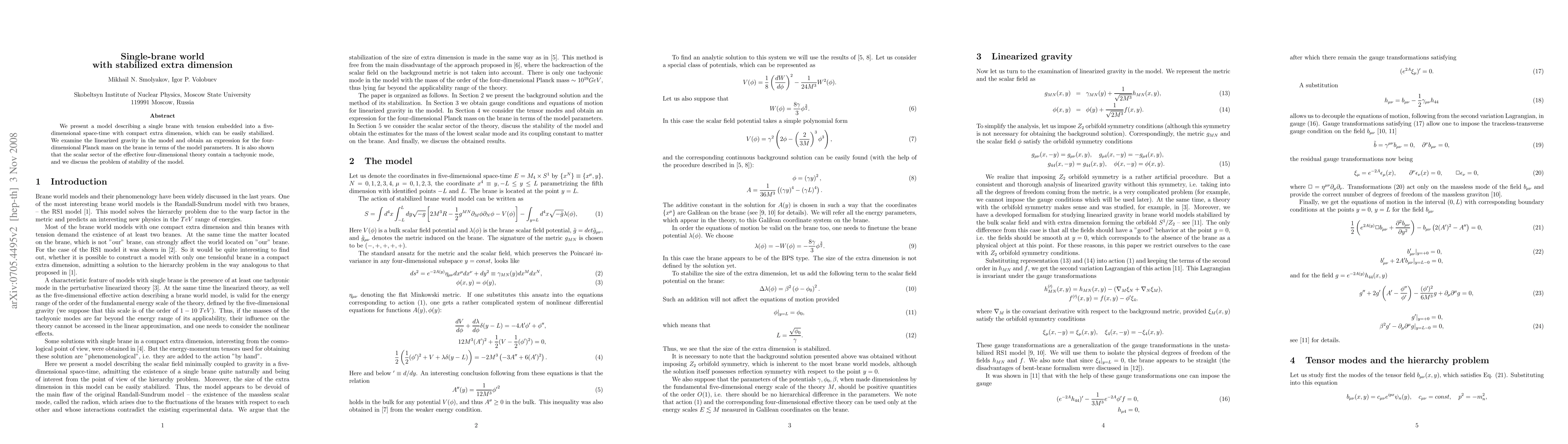 This paper proposes a single-brane model in a five-dimensional space with a stabilized compact extra dimension, analyzing linearized gravity and deriving the four-dimensional Planck mass. It also identifies a tachyonic mode in the scalar sector, raising concerns about the model's stability.