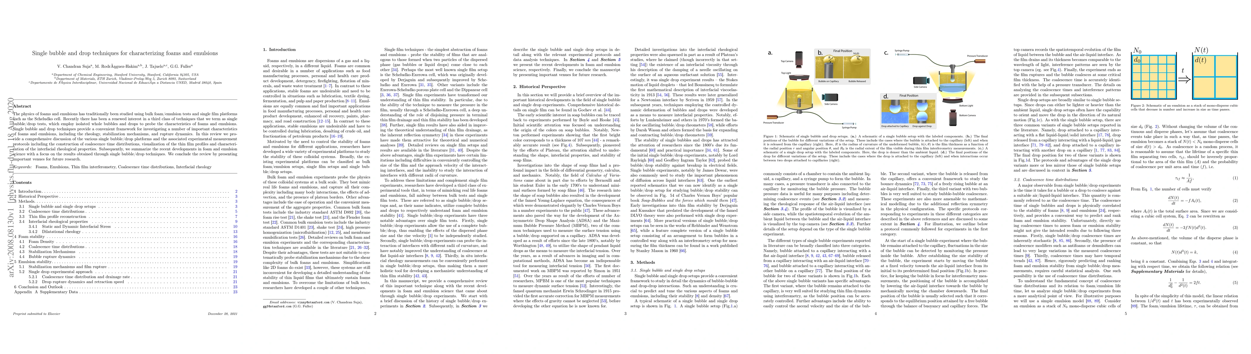 This paper reviews single bubble and drop techniques for characterizing foams and emulsions, detailing experimental protocols and their applications in studying rheology, stabilization mechanisms, and rupture dynamics. It highlights recent advancements in foam and emulsion science facilitated by these techniques and suggests future research directions.