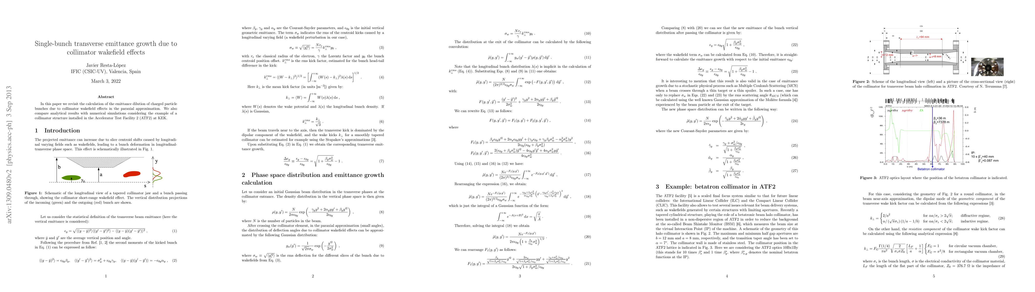 In this paper we revisit the calculation of the emittance dilution of charged particle bunches due to collimator wakefield effects in the paraxial approximation. We also compare analytical results with numerical simulations considering the example of a collimator structure installed in the Accelerator Test Facility 2 (ATF2) at KEK