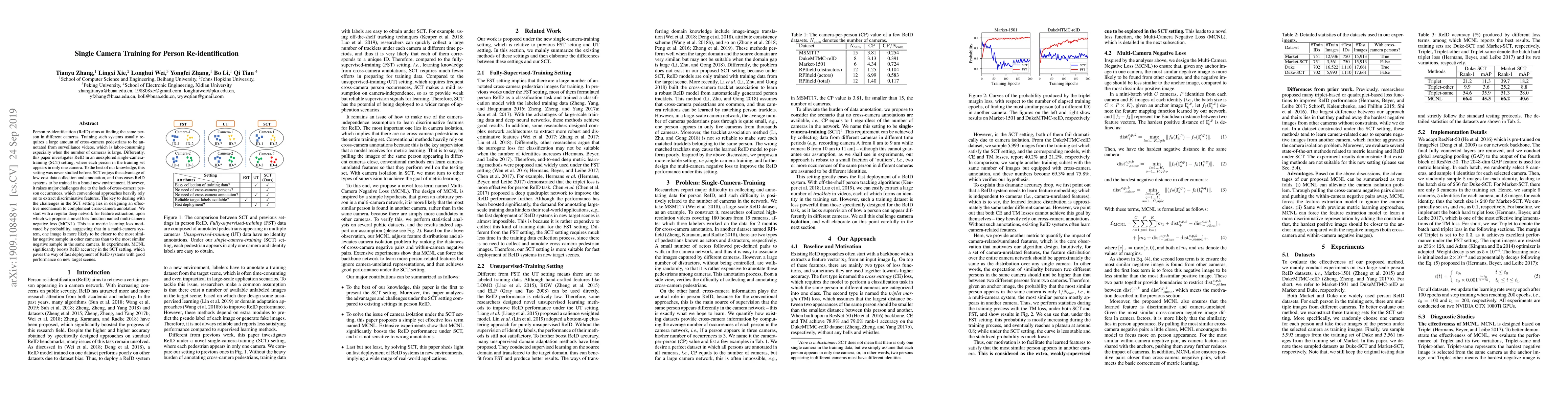 Person re-identification (ReID) aims at finding the same person in different cameras. Training such systems usually requires a large amount of cross-camera pedestrians to be annotated from surveillance videos, which is labor-consuming especially when the number of cameras is large. Differently, this paper investigates ReID in an unexplored single-camera-training (SCT) setting, where each person in the training set appears in only one camera. To the best of our knowledge, this setting was never studied before. SCT enjoys the advantage of low-cost data collection and annotation, and thus eases ReID systems to be trained in a brand new environment. However, it raises major challenges due to the lack of cross-camera person occurrences, which conventional approaches heavily rely on to extract discriminative features. The key to dealing with the challenges in the SCT setting lies in designing an effective mechanism to complement cross-camera annotation. We start with a regular deep network for feature extraction, upon which we propose a novel loss function named multi-camera negative loss (MCNL). This is a metric learning loss motivated by probability, suggesting that in a multi-camera system, one image is more likely to be closer to the most similar negative sample in other cameras than to the most similar negative sample in the same camera. In experiments, MCNL significantly boosts ReID accuracy in the SCT setting, which paves the way of fast deployment of ReID systems with good performance on new target scenes.