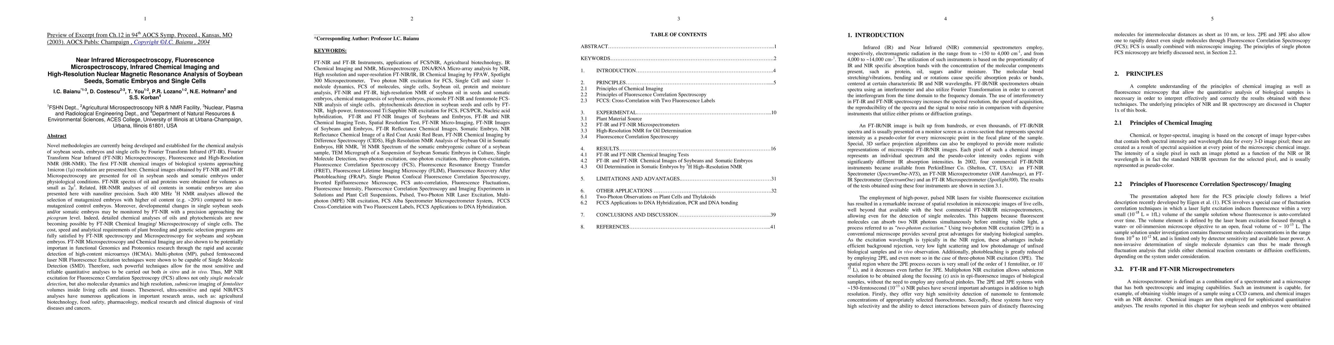 Novel techniques are currently being developed and established for the accurate chemical analysis and detection of single cancer cells, single embryos and single seeds by Fourier Transform Near Infrared (FT-NIR) Microspectroscopy, Fourier Transform Infrared (FT-IR), Fluorescence and High-Resolution NMR (HR-NMR). The first FT-NIR chemical images of biological systems approaching 1micron resolution are here reported. 400 and 500 MHz, H-1 NMR analyses were carried out that allowed the selection of mutagenized embryos. Detailed chemical analyses are being demonstrated to be also possible by FT-NIR Chemical Imaging/ Microspectroscopy of single cancer cells. FT-NIR Microspectroscopy and Chemical Imaging are also shown to be potentially important in Functional Genomics and Proteomics research through the rapid and accurate detection of high-content microarrays (HCMA). Multi-photon (MP), pulsed femtosecond laser NIR Fluorescence Excitation techniques were shown to be capable of Single Molecule Detection (SMD. Thus, MP NIR excitation for Fluorescence Correlation Spectroscopy (FCS) allowed not only single molecule detection, but also molecular dynamics observations and high resolution, submicron imaging of sub-femtoliter volumes inside living cells with 0.25 micron spatial resolution, in both normal and cancer cells, as well as neoplastic tissues. These novel, ultra-sensitive and rapid FT-NIR/FCS analyses have, therefore, substantial potential for numerous applications in important research areas, such as: medicine, medical/cancer research, pharmacology, agricultural biotechnology, food safety, as well as clinical diagnosis of viral diseases and cancers.