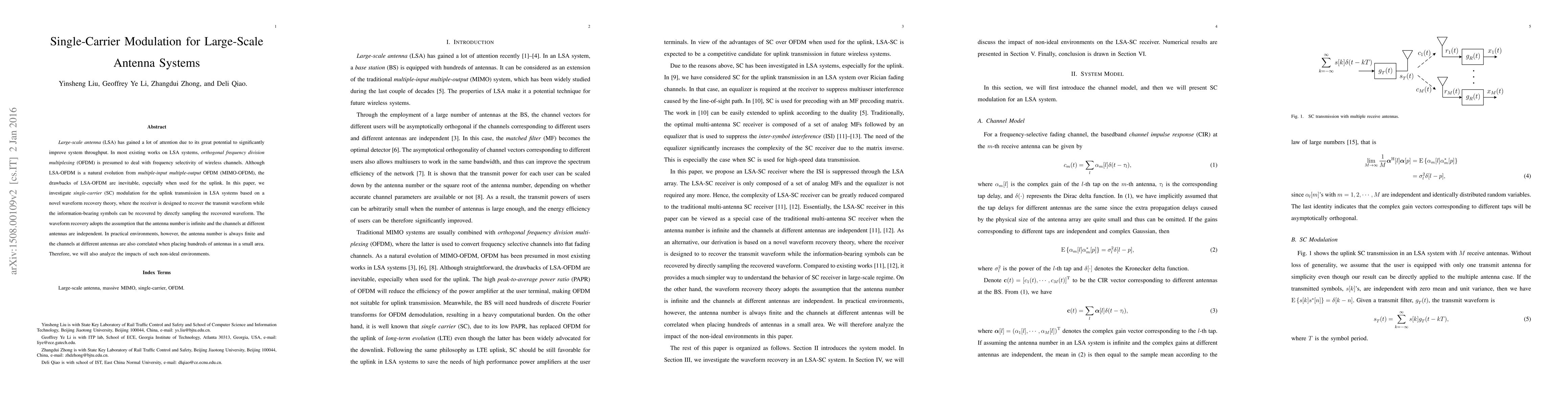 This paper explores single-carrier modulation for uplink transmission in large-scale antenna systems, proposing a novel waveform recovery theory to address frequency selectivity. It examines the practical impacts of finite antenna numbers and correlated channels, contrasting with traditional LSA-OFDM approaches.
