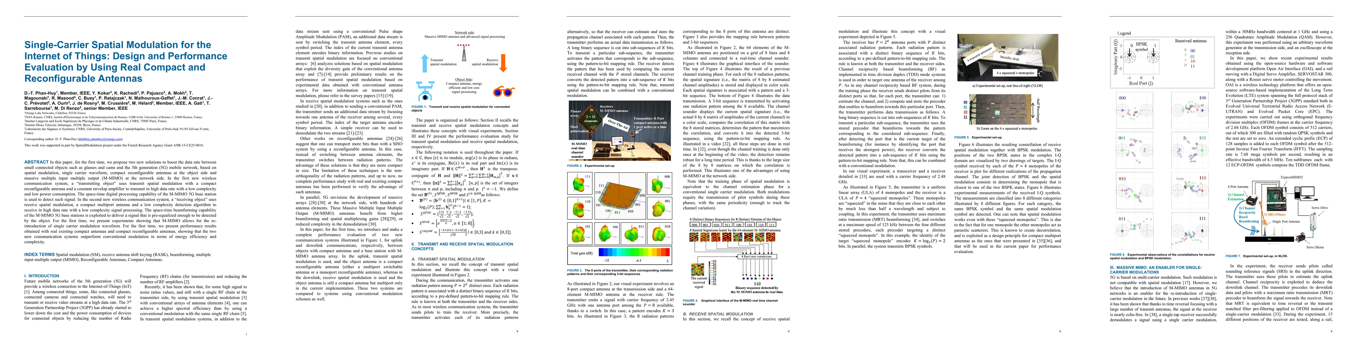 In this paper, for the first time, we propose two new solutions to boost the data rate between small connected objects such as glasses and cams and the 5th generation (5G) mobile network, based on spatial modulation, single carrier waveform, compact reconfigurable antennas at the object side and massive multiple input multiple output (M-MIMO) at the network side. In the first new wireless communication system, a "transmitting object" uses transmit spatial modulation with a compact reconfigurable antenna and a constant envelop amplifier to transmit in high data rate with a low complexity and low power consumption. The space-time digital processing capability of the M-MIMO 5G base station is used to detect such signal. In the second new wireless communication system, a "receiving object" uses receive spatial modulation, a compact multiport antenna and a low complexity detection algorithm to receive in high data rate with a low complexity signal processing. The space-time beamforming capability of the M-MIMO 5G base stations is exploited to deliver a signal that is pre-equalized enough to be detected by the object. For the first time, we present experiments showing that M-MIMO allows for the re-introduction of single carrier modulation waveform. For the first time, we present performance results obtained with real existing compact antennas and compact reconfigurable antennas, showing that the two new communication systems outperform conventional modulation in terms of energy efficiency and complexity.