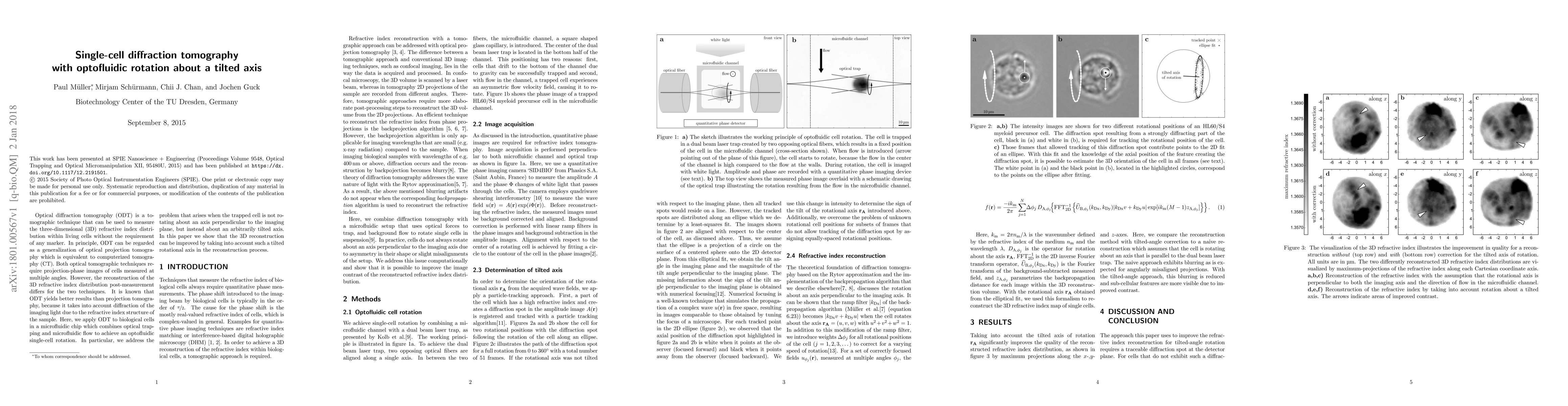 This paper presents an advanced optical diffraction tomography technique using optofluidic rotation in a microfluidic chip to achieve precise single-cell 3D refractive index measurements. It demonstrates that accounting for a tilted rotational axis during reconstruction significantly enhances 3D reconstruction accuracy.
