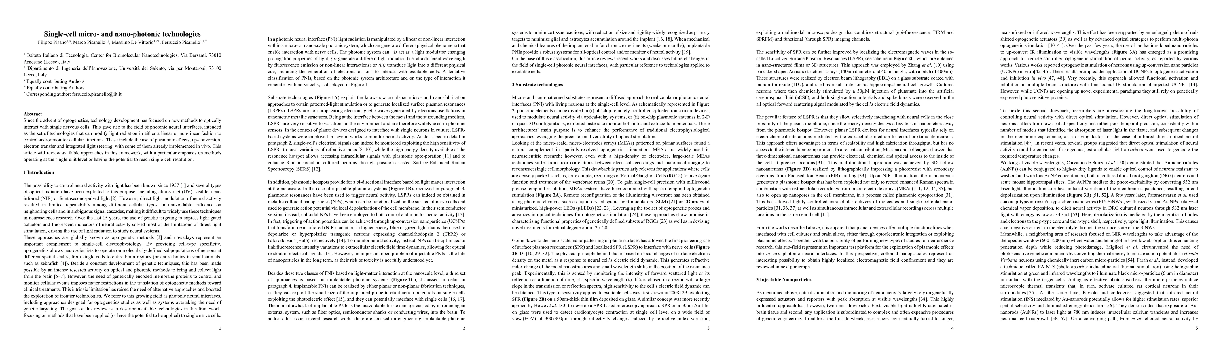 Since the advent of optogenetics, technology development has focused on new methods to optically interact with single nervous cells. This gave rise to the field of photonic neural interfaces, intended as the set of technologies that can modify light radiation in either a linear or non-linear fashion to control and/or monitor cellular functions. These include the use of plasmonic effects, up-conversion, electron transfer and integrated light steering, with some of them already implemented in vivo. This article will review available approaches in this framework, with a particular emphasis on methods operating at the single-unit level or having the potential to reach single-cell resolution.