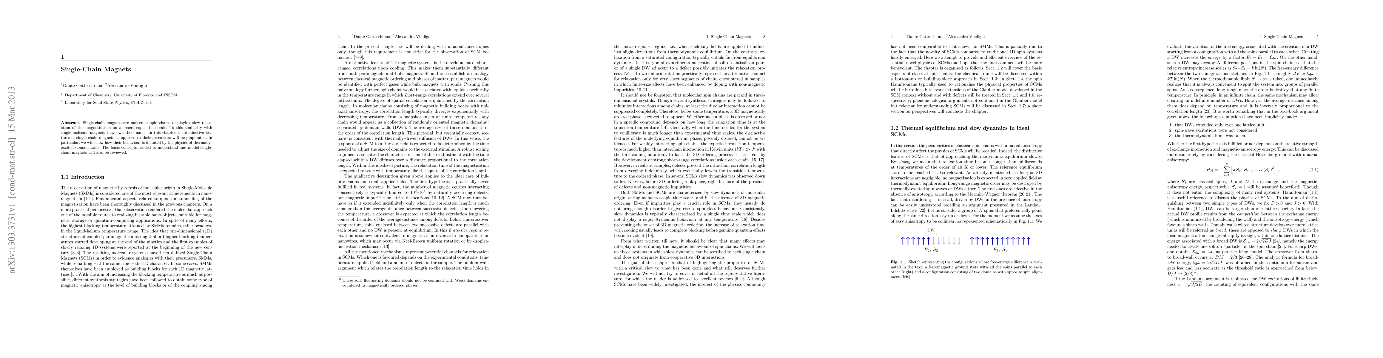 Single-chain magnets are molecular spin chains displaying slow relaxation of the magnetisation on a macroscopic time scale. To this similarity with single-molecule magnets they own their name. In this chapter the distinctive features of single-chain magnets as opposed to their precursors will be pinpointed. In particular, we will show how their behaviour is dictated by the physics of thermally-excited domain walls. The basic concepts needed to understand and model single-chain magnets will also be reviewed.