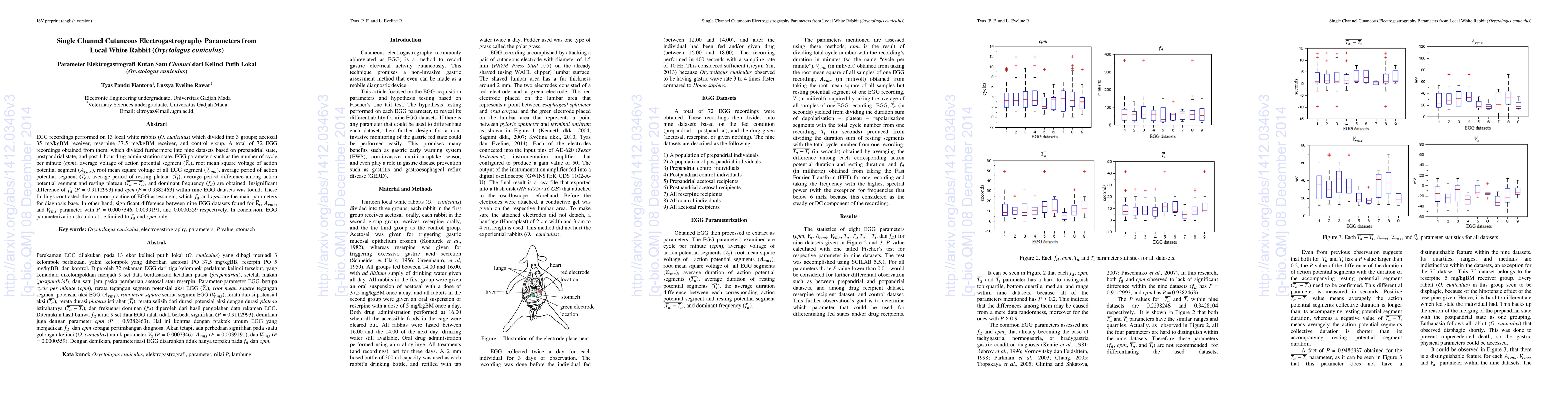 This study used 13 local white rabbits (Oryctolagus cuniculus) divided into three groups: acetosal, reserpine, and control. Cutaneous electrogastrography (EGG) recordings were taken twice daily for three days, with parameters such as cycle per minute (cpm), average voltage, root mean square voltages, average periods, and dominant frequency analyzed.