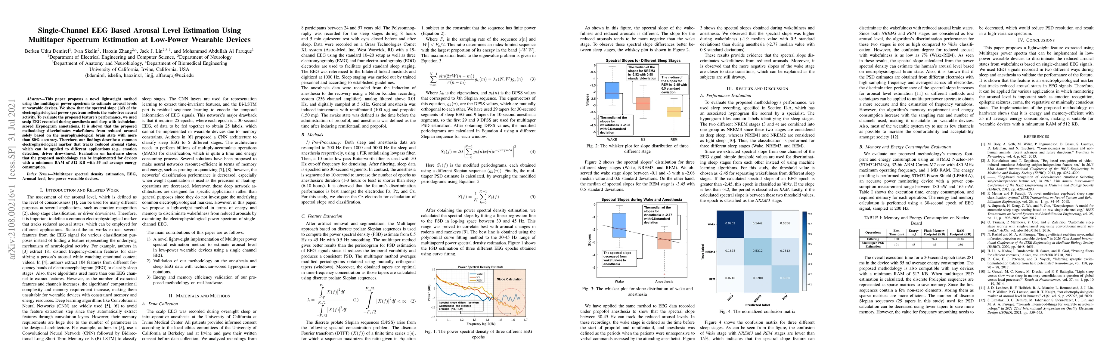 This paper proposes a novel lightweight method using the multitaper power spectrum to estimate arousal levels at wearable devices. We show that the spectral slope (1/f) of the electrophysiological power spectrum reflects the scale-free neural activity. To evaluate the proposed feature's performance, we used scalp EEG recorded during anesthesia and sleep with technician-scored Hypnogram annotations. It is shown that the proposed methodology discriminates wakefulness from reduced arousal solely based on the neurophysiological brain state with more than 80% accuracy. Therefore, our findings describe a common electrophysiological marker that tracks reduced arousal states, which can be applied to different applications (e.g., emotion detection, driver drowsiness). Evaluation on hardware shows that the proposed methodology can be implemented for devices with a minimum RAM of 512 KB with 55 mJ average energy consumption.