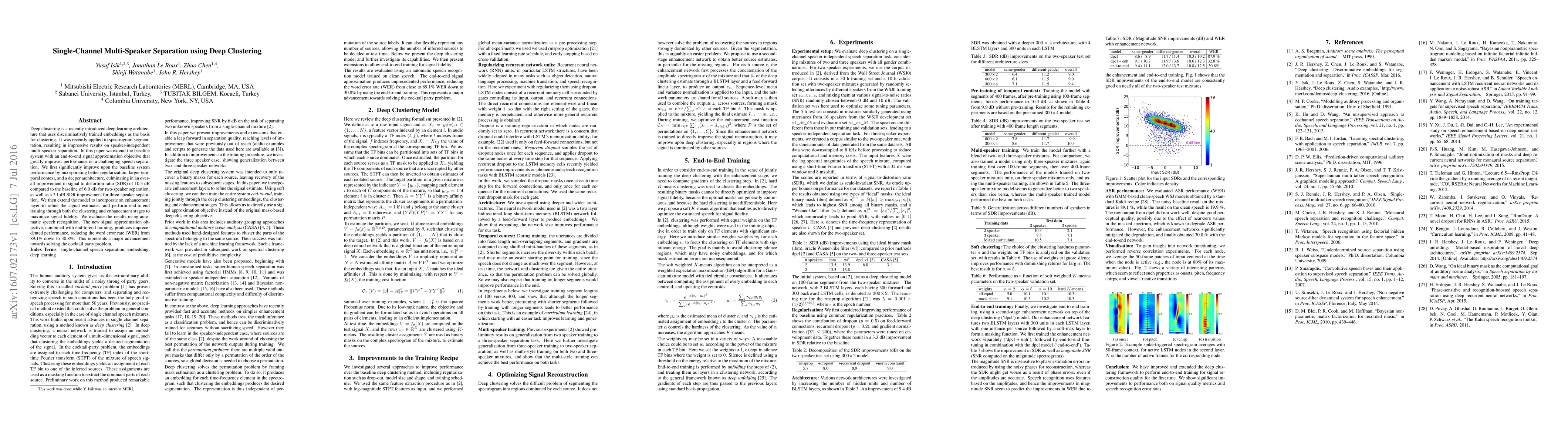 This paper presents a deep clustering approach for single-channel multi-speaker separation, significantly improving performance through enhanced regularization, larger temporal context, and a deeper architecture. The end-to-end signal approximation and enhancement layer reduce the word error rate by 58.3%, achieving a major breakthrough in speech separation.