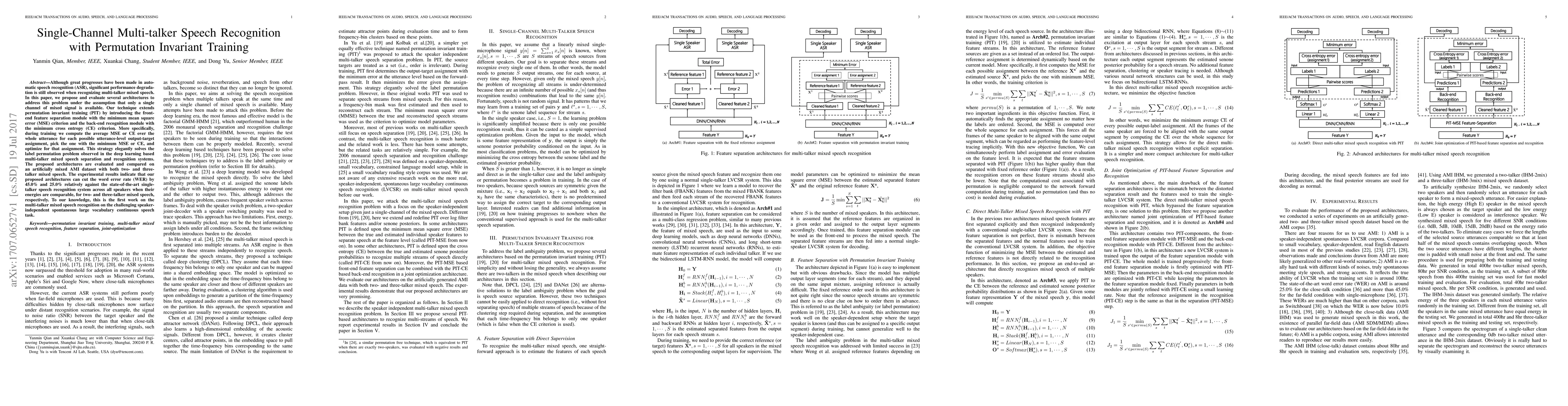 This paper proposes new architectures for single-channel multi-talker speech recognition using permutation invariant training (PIT) with an MSE-based front-end and CE-based back-end. The method reduces the word error rate by 45.0% and 25.0% for two- and three-talker mixed speech compared to the best single-talker system, demonstrating significant improvement in challenging multi-talker scenarios.