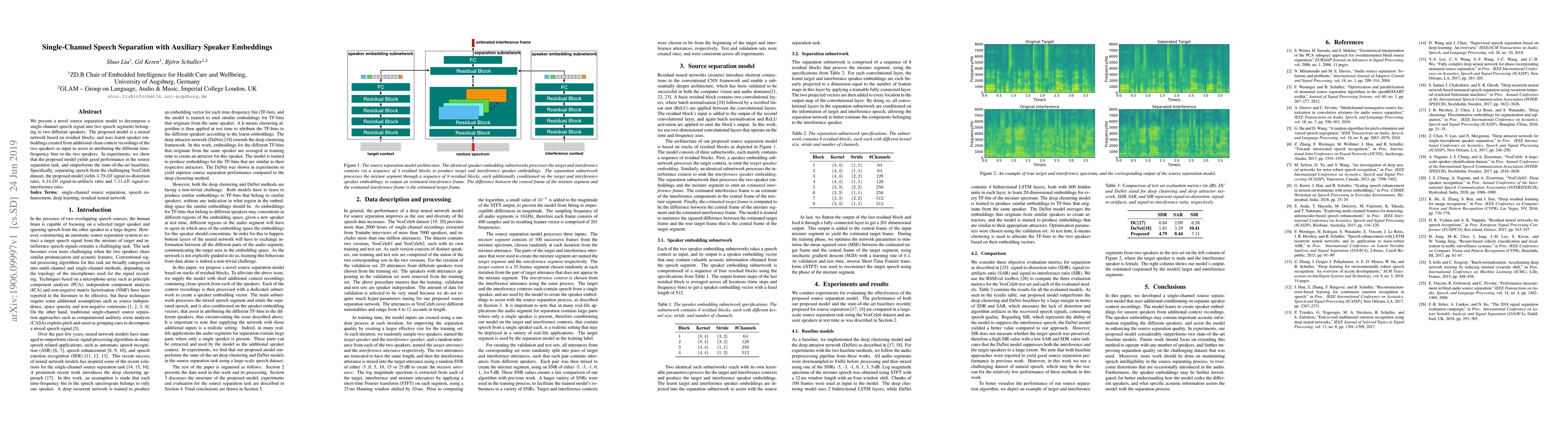 We present a novel source separation model to decompose asingle-channel speech signal into two speech segments belonging to two different speakers. The proposed model is a neural network based on residual blocks, and uses learnt speaker embeddings created from additional clean context recordings of the two speakers as input to assist in attributing the different time-frequency bins to the two speakers. In experiments, we show that the proposed model yields good performance in the source separation task, and outperforms the state-of-the-art baselines. Specifically, separating speech from the challenging VoxCeleb dataset, the proposed model yields 4.79dB signal-to-distortion ratio, 8.44dB signal-to-artifacts ratio and 7.11dB signal-to-interference ratio.