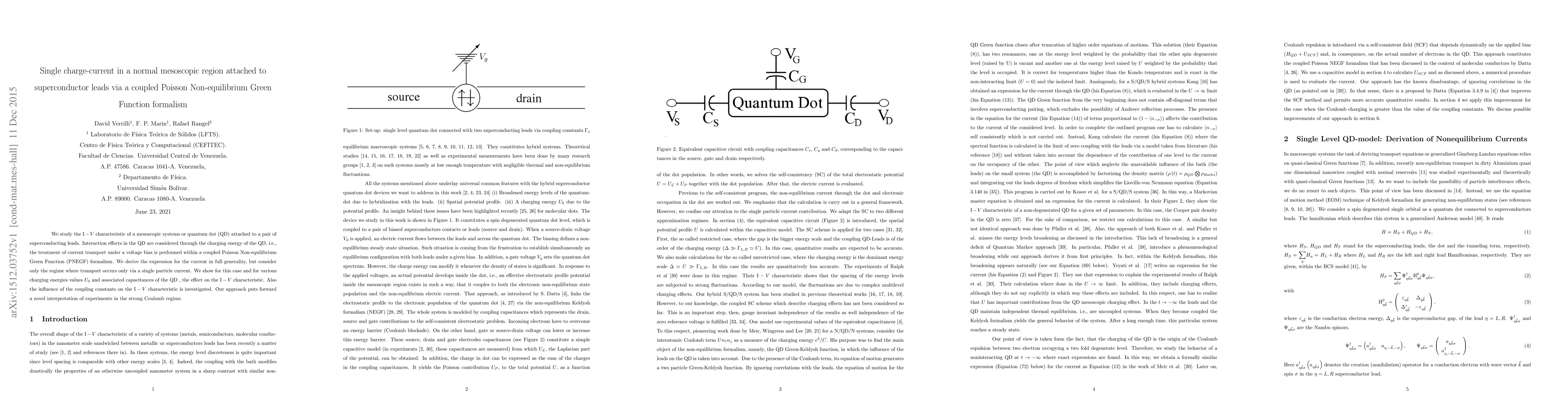 We study the I-V characteristic of mesoscopic systems or Quantum dot attached of a pair of superconducting leads. Interaction effects in the quantum dot are considered through the charging energy of the quantum dot; the treatment of such effects are considered within a Poisson-non-equilibrium function scheme.