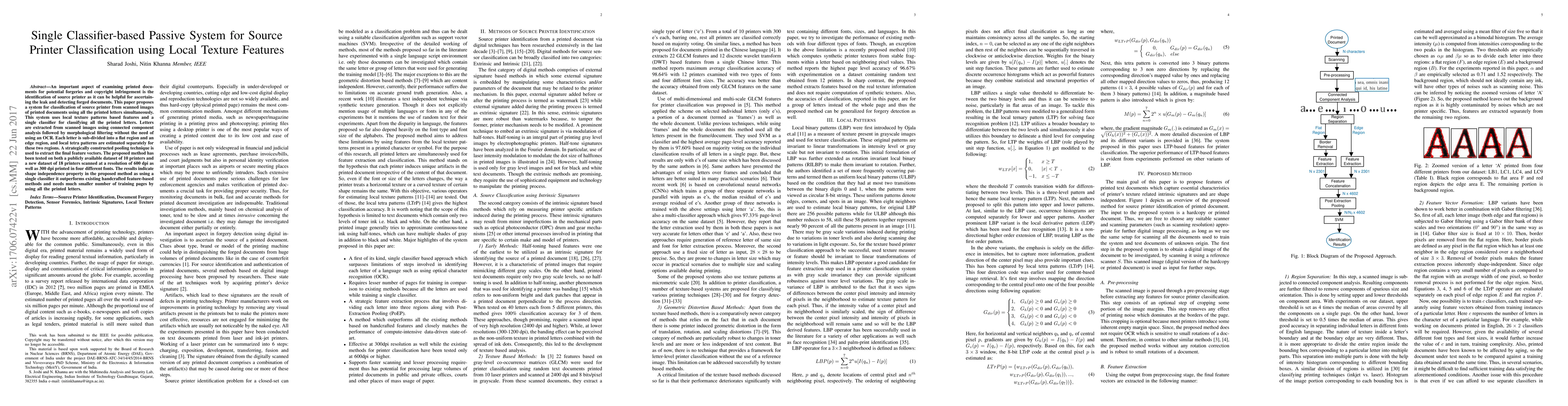 A new system uses local texture patterns to classify source printers from scanned documents without OCR, outperforming existing methods with a single classifier.