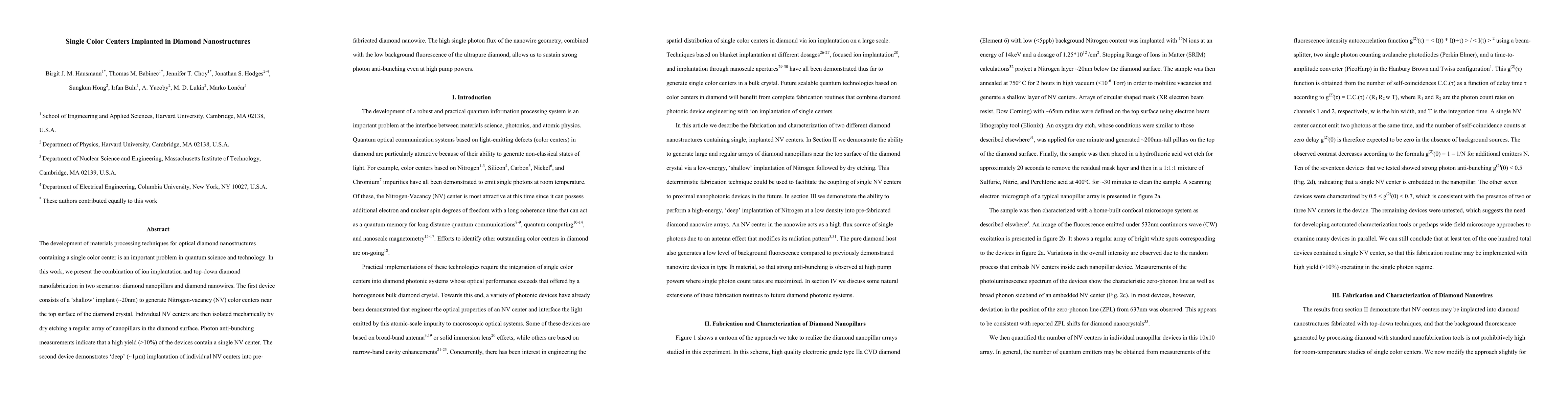 This research presents methods for creating optical diamond nanostructures with single Nitrogen-vacancy (NV) color centers using ion implantation and nanofabrication, achieving high yields and strong photon anti-bunching in both nanopillars and nanowire configurations.