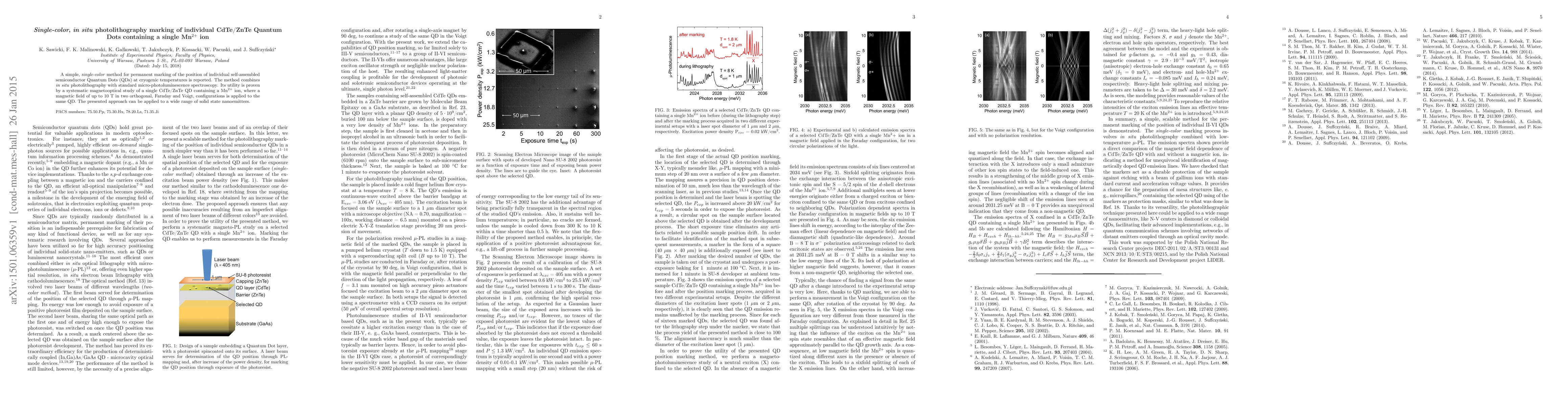 A simple, single-color method for permanent marking of the position of individual self-assembled semiconductor Quantum Dots (QDs) at cryogenic temperatures is reported. The method combines in situ photolithography with standard micro-photoluminescence spectroscopy. Its utility is proven by a systematic magnetooptical study of a single CdTe/ZnTe QD containing a Mn2+ ion, where a magnetic field of up to 10 T in two orthogonal, Faraday and Voigt, configurations is applied to the same QD. The presented approach can be applied to a wide range of solid state nanoemitters.