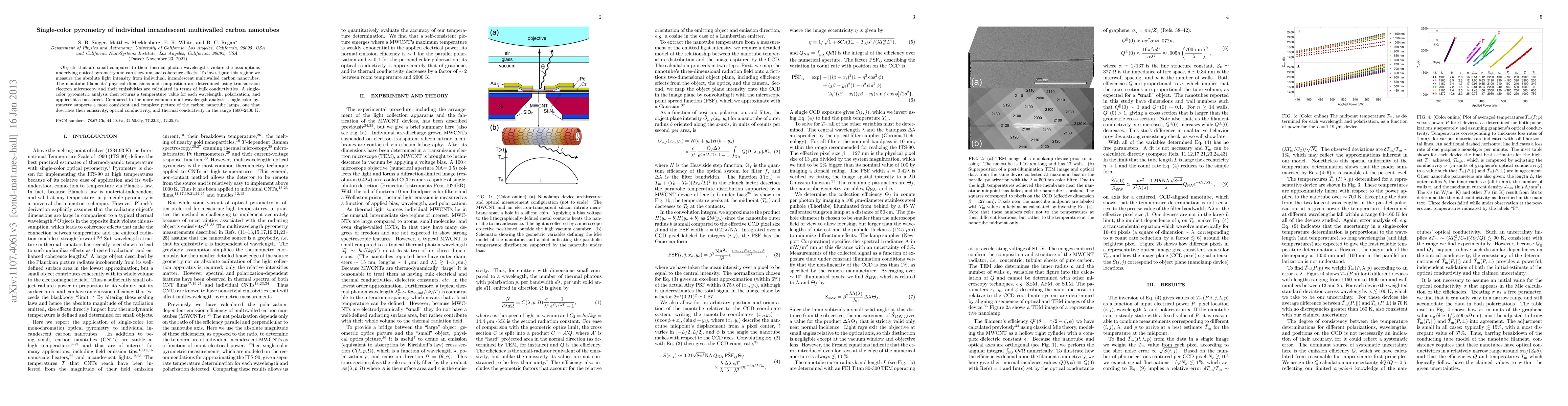 Objects that are small compared to their thermal photon wavelengths violate the assumptions underlying optical pyrometry and can show unusual coherence effects. To investigate this regime we measure the absolute light intensity from individual, incandescent multiwalled carbon nanotubes. The nanotube filaments' physical dimensions and composition are determined using transmission electron microscopy and their emissivities are calculated in terms of bulk conductivities. A single-color pyrometric analysis then returns a temperature value for each wavelength, polarization, and applied bias measured. Compared to the more common multiwavelength analysis, single-color pyrometry supports a more consistent and complete picture of the carbon nanotube lamps, one that describes their emissivity, optical conductivity, and thermal conductivity in the range 1600-2400 K.
