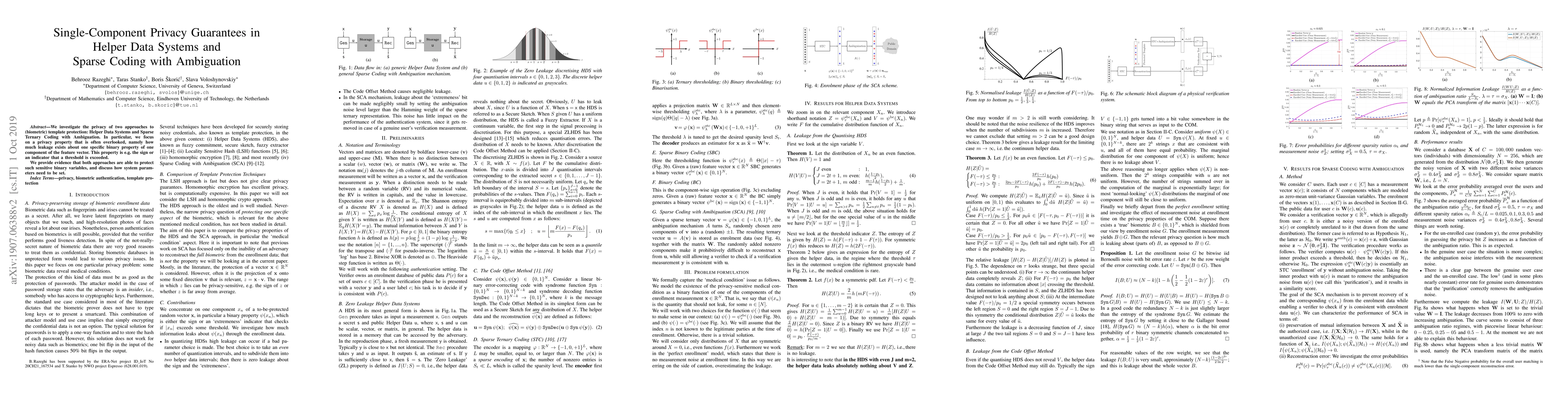 This paper examines the privacy guarantees of Helper Data Systems and Sparse Ternary Coding with Ambiguization for biometric template protection, focusing on leakage of specific binary properties. It concludes that both methods can effectively safeguard sensitive binary variables, contingent on appropriate parameter settings.