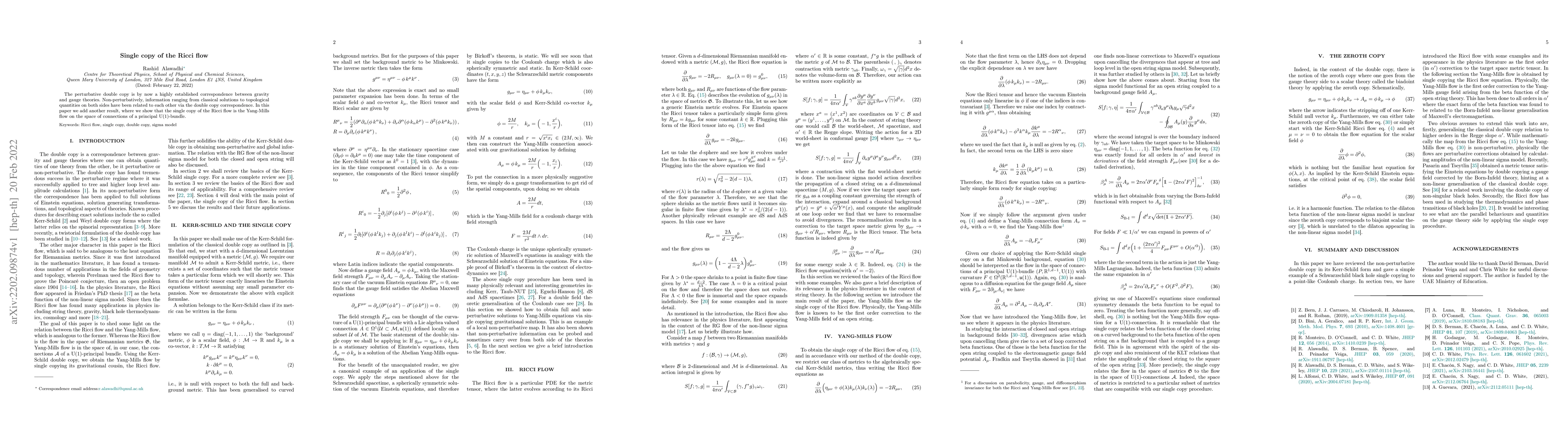 The paper reviews the non-perturbative double copy in its Kerr-Schild form and provides an example of a Schwarzschild black hole single copying to a point-like Coulomb charge. It introduces the Ricci flow with examples and its appearance in the physics literature as the first-order correction to the target space metric tensor. The Yang-Mills flow is obtained by single copying the Ricci flow equation, representing the first-order correction to the Yang-Mills gauge field arising from the open string theory beta function, found to all orders in α′.