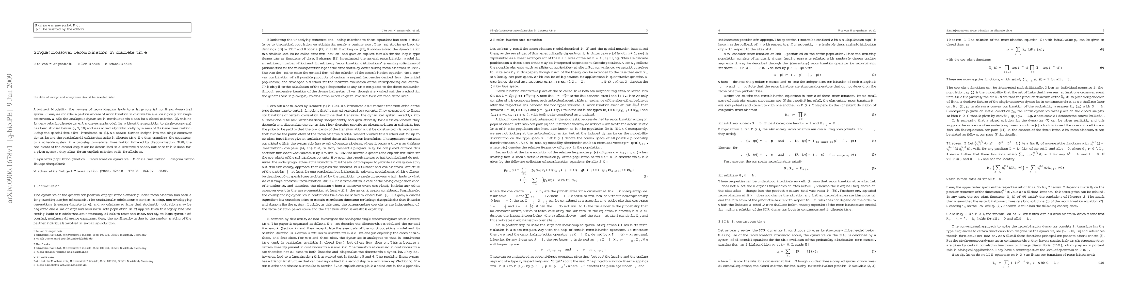Researchers studied recombination in discrete time with single crossovers, developing a new method to solve the complex system. They transformed equations through linearization and diagonalization to find an explicit solution valid for all times.
