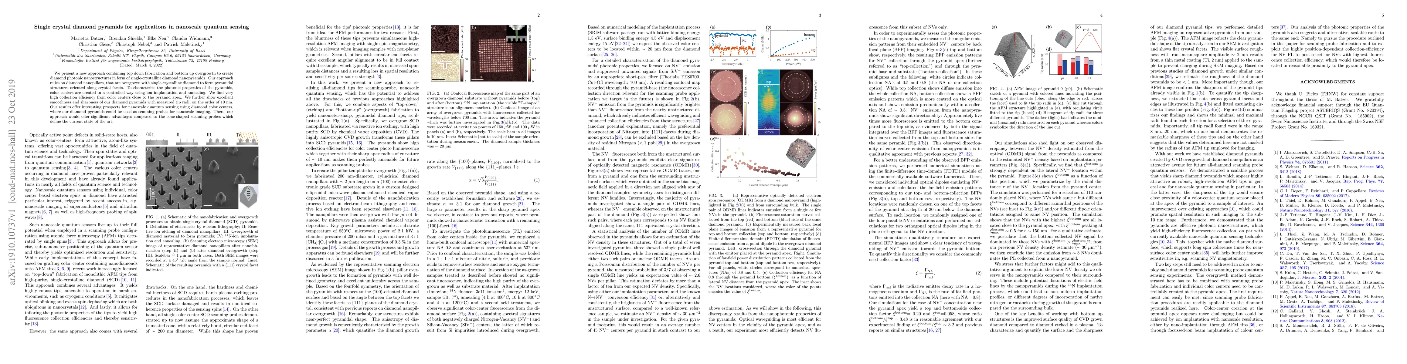 This paper introduces a novel method for creating single-crystalline diamond nanopyramids using a combination of top-down fabrication and bottom-up overgrowth, showing high collection efficiency and sharp pyramidal tips. These structures hold promise for advanced nanoscale quantum sensing applications, potentially surpassing current cone-shaped scanning probes.