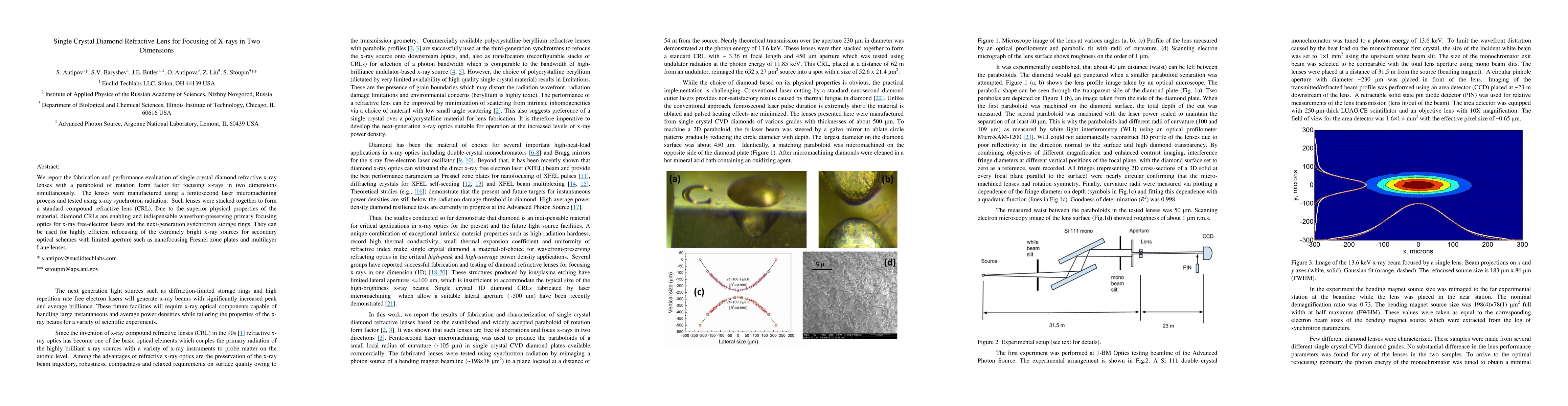 This paper details the fabrication and testing of single crystal diamond refractive lenses designed to focus x-rays in two dimensions. The lenses, manufactured via femtosecond laser micromachining, show promise for use in advanced x-ray optics, including x-ray free-electron lasers and next-generation synchrotron storage rings.