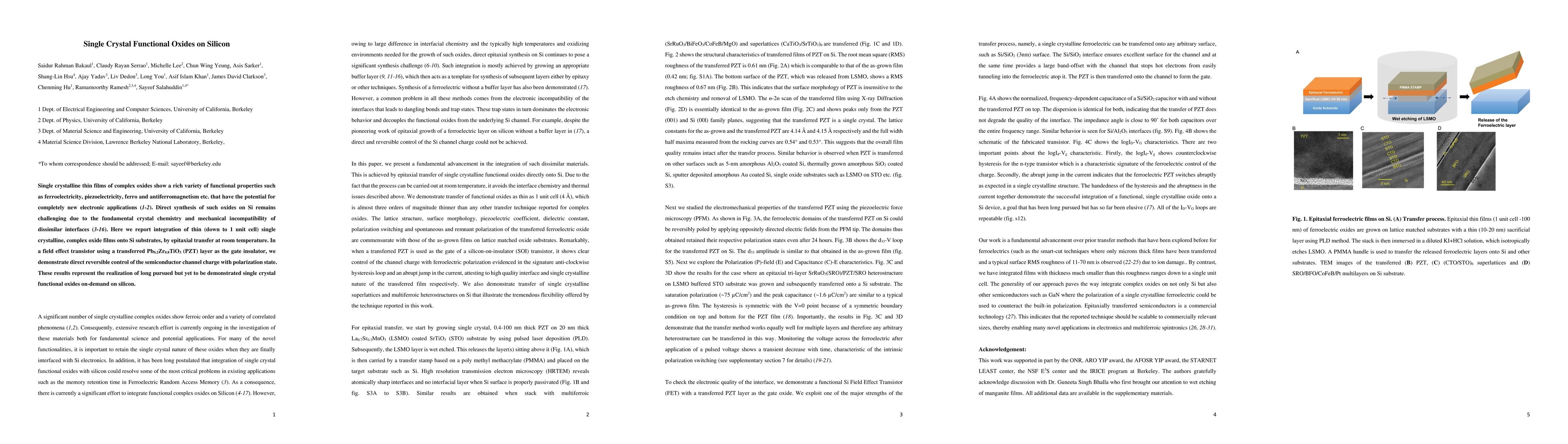 This paper reports the successful integration of ultra-thin single crystalline complex oxide films onto silicon substrates through epitaxial transfer, achieving functional properties such as ferroelectricity. It demonstrates direct, reversible control of semiconductor channel charge via polarization state in a field effect transistor, marking a significant advancement in functional oxides on silicon.