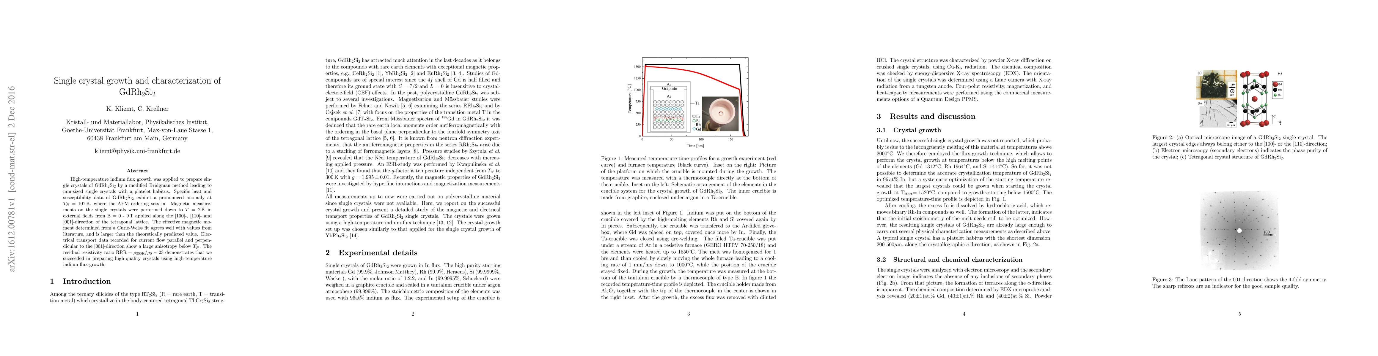 High-temperature indium flux growth was applied to prepare single crystals of GdRh$_2$Si$_2$ by a modified Bridgman method leading to mm-sized single crystals with a platelet habitus. Specific heat and susceptibility data of GdRh$_2$Si$_2$ exhibit a pronounced anomaly at $T_N = 107\rm \,K$, where the AFM ordering sets in. Magnetic measurements on the single crystals were performed down to $T = 2$\,K in external fields from B = 0 - 9\,T applied along the $[100]$-, $[110]$- and $[001]$-direction of the tetragonal lattice. The effective magnetic moment determined from a Curie-Weiss fit agrees well with values from literature, and is larger than the theoretically predicted value. Electrical transport data recorded for current flow parallel and perpendicular to the $[001]$-direction show a large anisotropy below $T_N$. The residual resistivity ratio $\rm RRR=\rho_{300K}/\rho_{0}\sim 23$ demonstrates that we succeeded in preparing high-quality crystals using high-temperature indium flux-growth.