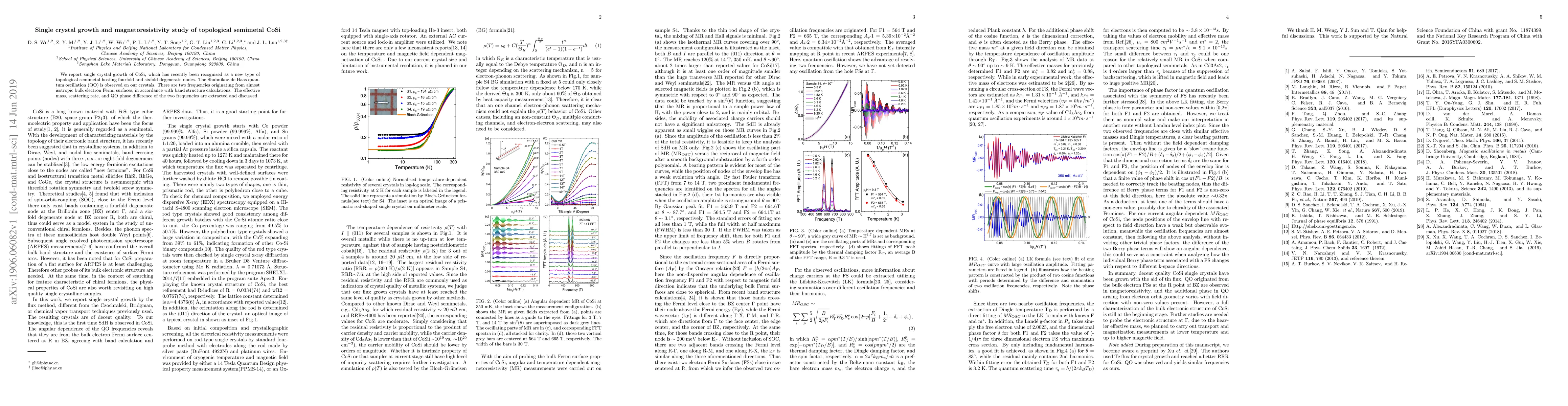 This paper details the growth of single crystals of CoSi, a newly identified topological semimetal, and investigates its magnetoresistivity through Shubnikov-de Haas quantum oscillations. The study reveals two frequencies from nearly isotropic bulk electron Fermi surfaces, consistent with theoretical predictions.