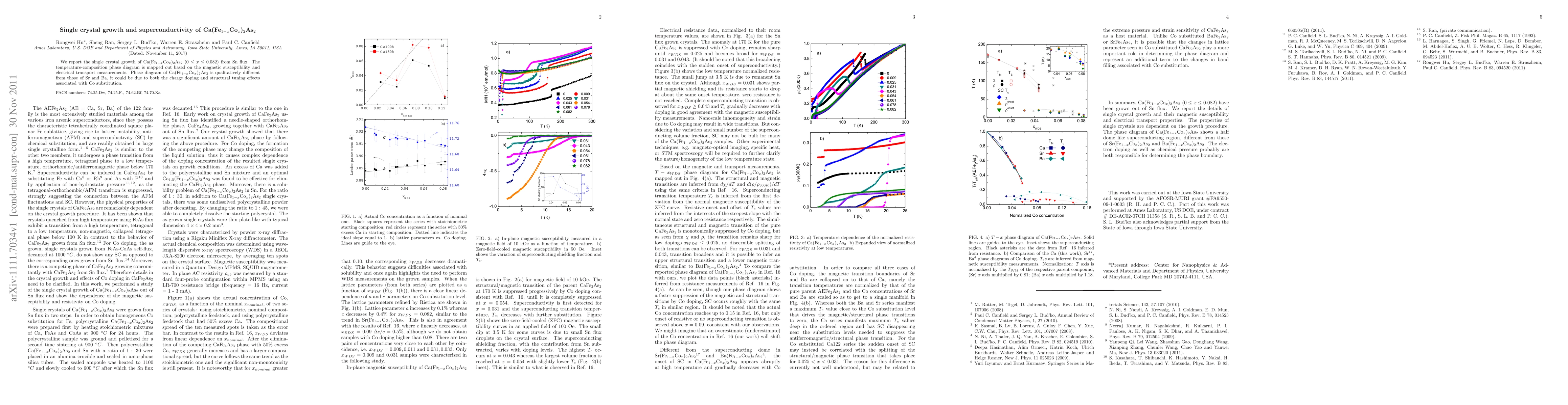This paper details the growth of Ca(Fe1-xCox)2As2 single crystals using Sn flux and explores their superconductivity. The study reveals a distinct temperature-composition phase diagram influenced by Co substitution, differing from Sr and Ba analogs due to charge doping and structural changes.