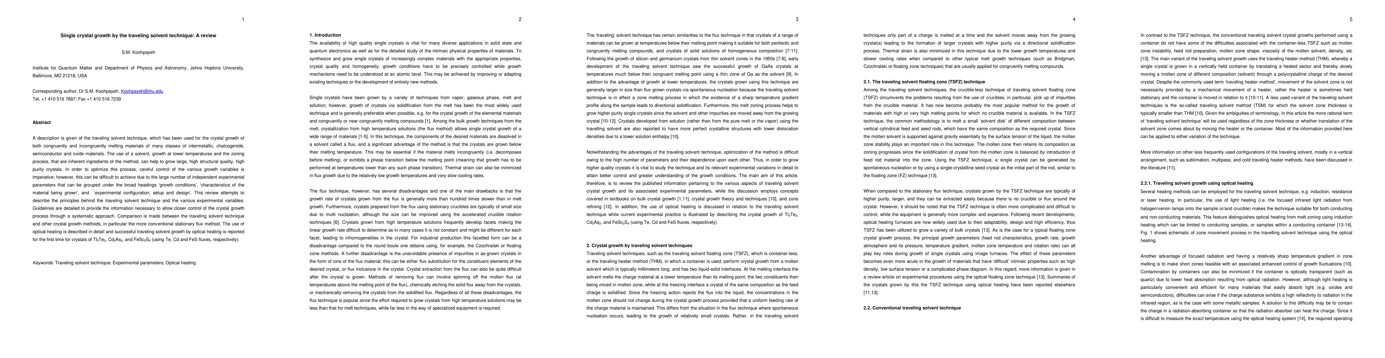 This review outlines the traveling solvent technique for growing high-quality, large crystals of various materials, emphasizing the importance of controlling numerous experimental parameters. It compares this method with the conventional stationary flux method and reports successful growth using optical heating for specific crystals.