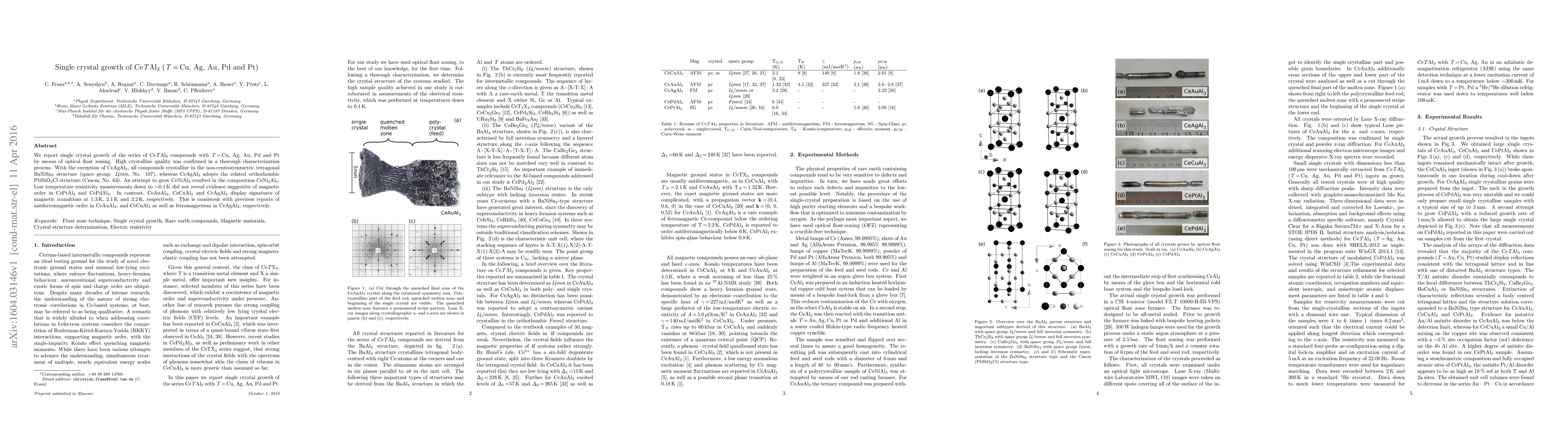 We report single crystal growth of the series of CeTAl$_3$ compounds with T = Cu, Ag, Au, Pd and Pt by means of optical float zoning. High crystalline quality was confirmed in a thorough characterization process. With the exception of CeAgAl$_3$, all compounds crystallize in the non-centrosymmetric tetragonal BaNiSn$_{3}$ structure (space group: I4mm, No. 107), whereas CeAgAl$_3$ adopts the related orthorhombic PbSbO$_2$Cl structure (Cmcm, No. 63). An attempt to grow CeNiAl$_3$ resulted in the composition CeNi$_2$Al$_5$. Low temperature resistivity measurements down to $\sim$0.1K did not reveal evidence suggestive of magnetic order in CePtAl$_3$ and CePdAl$_3$. In contrast, CeAuAl$_3$, CeCuAl$_3$ and CeAgAl$_3$ display signatures of magnetic transitions at 1.3K, 2.1K and 3.2K, respectively. This is consistent with previous reports of antiferromagnetic order in CeAuAl$_3$, and CeCuAl$_3$ as well as ferromagnetism in CeAgAl$_3$, respectively.