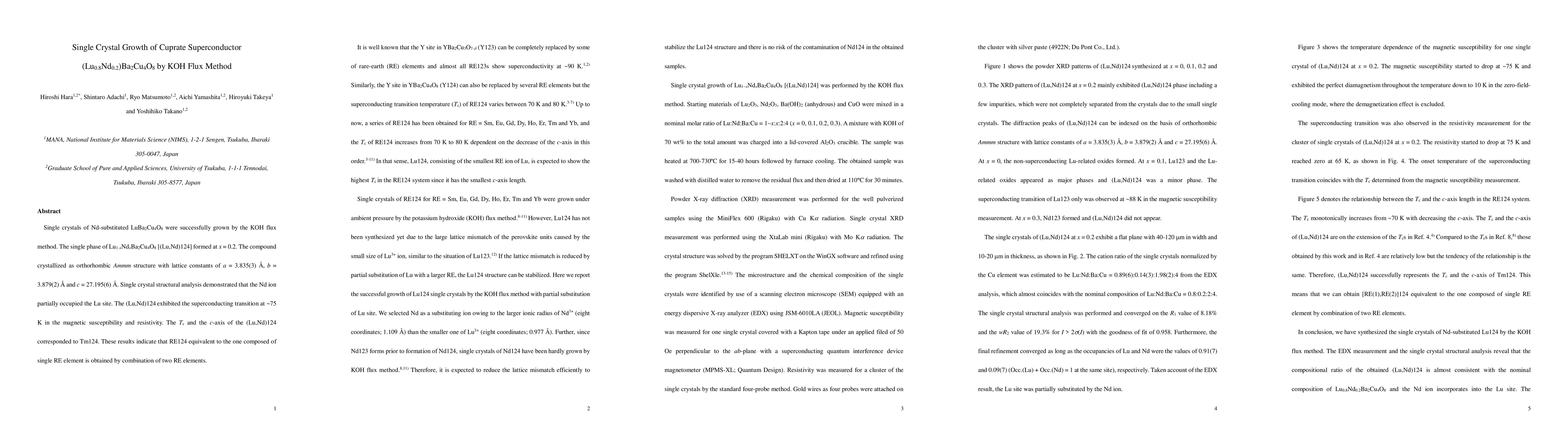 Single crystals of Nd-substituted LuBa$_2$Cu$_4$O$_8$ were successfully grown by the KOH flux method. The single phase of Lu$_{1-x}$Nd$_x$Ba$_2$Cu$_4$O$_8$ [(Lu,Nd)124] formed at $x = 0.2$. The compound crystallized as orthorhombic Ammm structure with lattice constants of a = 3.835(3) {\AA}, b = 3.879(2) {\AA} and c = 27.195(6) {\AA}. Single crystal structural analysis demonstrated that the Nd ion partially occupied the Lu site. The (Lu,Nd)124 exhibited the superconducting transition at ~75 K in the magnetic susceptibility and resistivity. The $T_c$ and the c-axis of the (Lu,Nd)124 corresponded to Tm124. These results indicate that RE124 equivalent to the one composed of single RE element is obtained by combination of two RE elements.