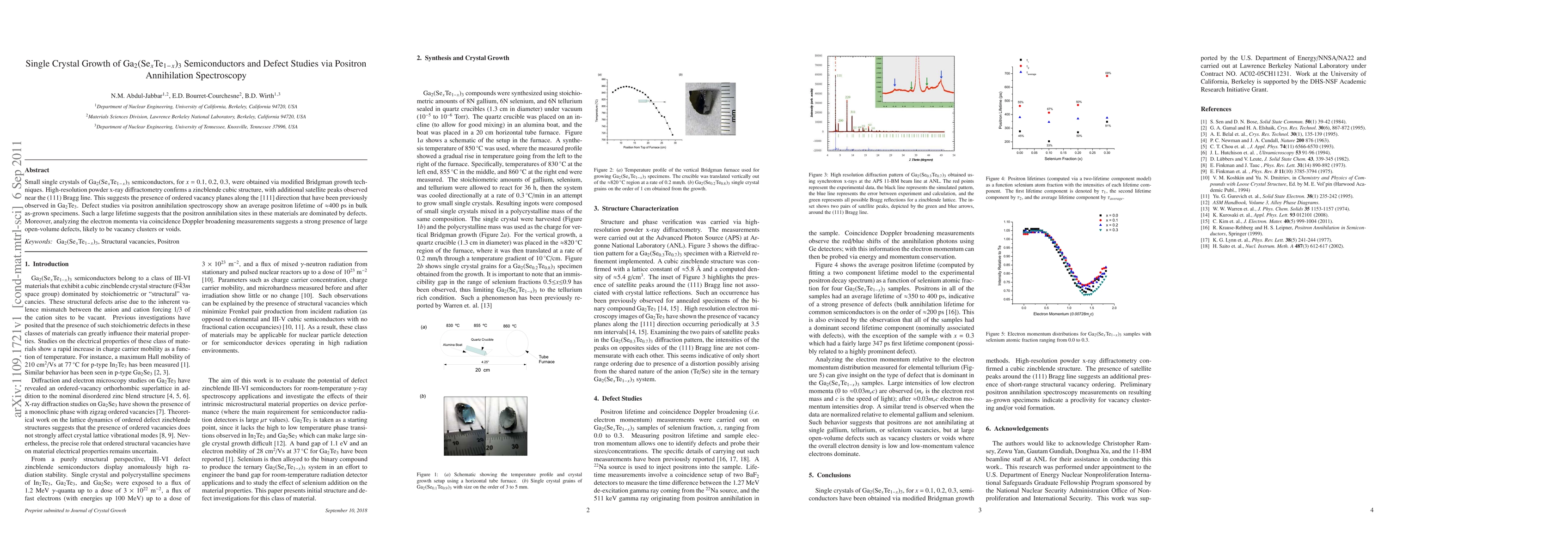 Small single crystals of Ga2(SexTe1-x)3 semiconductors, for x = 0.1, 0.2, 0.3, were obtained via modified Bridgman growth techniques. High-resolution powder x-ray diffractometry confirms a zincblende cubic structure, with additional satellite peaks observed near the (111) Bragg line. This suggests the presence of ordered vacancy planes along the [111] direction that have been previously observed in Ga2Te3. Defect studies via positron annihilation spectroscopy show an average positron lifetime of ~400 ps in bulk as-grown specimens. Such a large lifetime suggests that the positron annihilation sites in these materials are dominated by defects. Moreover, analyzing the electron momenta via coincidence Doppler broadening measurements suggests a strong presence of large open-volume defects, likely to be vacancy clusters or voids.