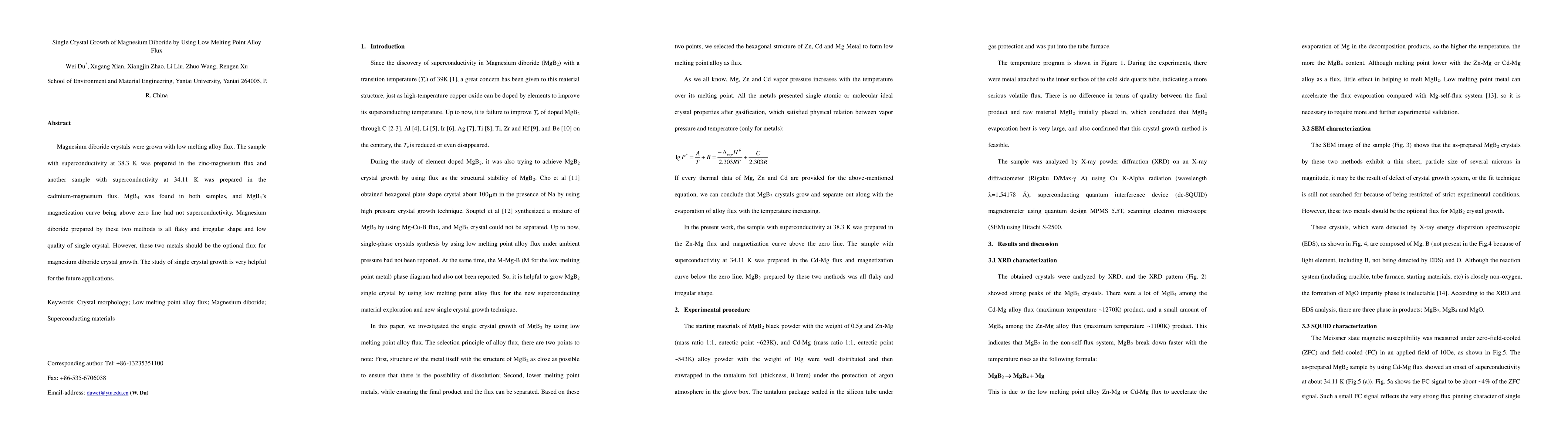 Magnesium diboride crystals were grown with low melting alloy flux. The sample with superconductivity at 38.3 K was prepared in the zinc-magnesium flux and another sample with superconductivity at 34.11 K was prepared in the cadmium-magnesium flux. MgB4 was found in both samples, and MgB4's magnetization curve being above zero line had not superconductivity. Magnesium diboride prepared by these two methods is all flaky and irregular shape and low quality of single crystal. However, these two metals should be the optional flux for magnesium diboride crystal growth. The study of single crystal growth is very helpful for the future applications.