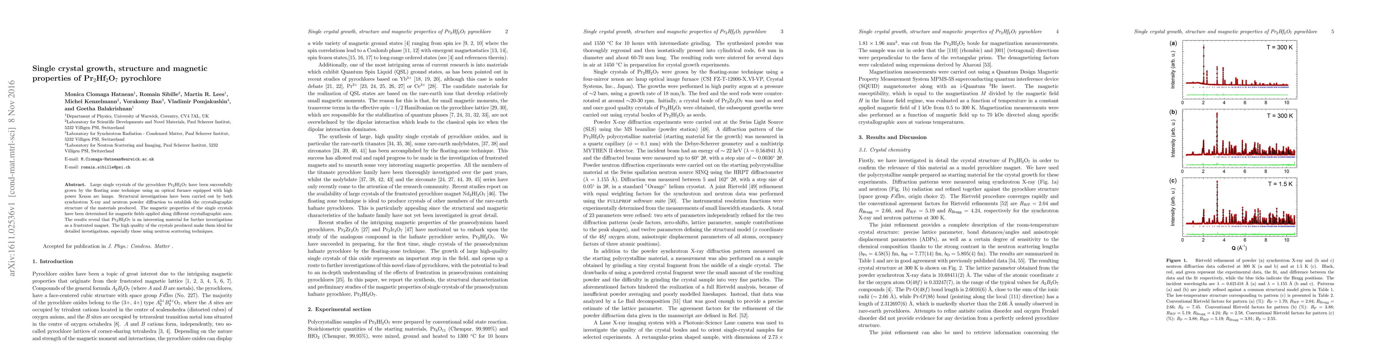 Large single crystals of the pyrochlore Pr2Hf2O7 were grown using the floating zone technique, and their crystallographic structure was determined via synchrotron X-ray and neutron powder diffraction. The material exhibits intriguing magnetic properties, suggesting it could be a promising frustrated magnet for further study.