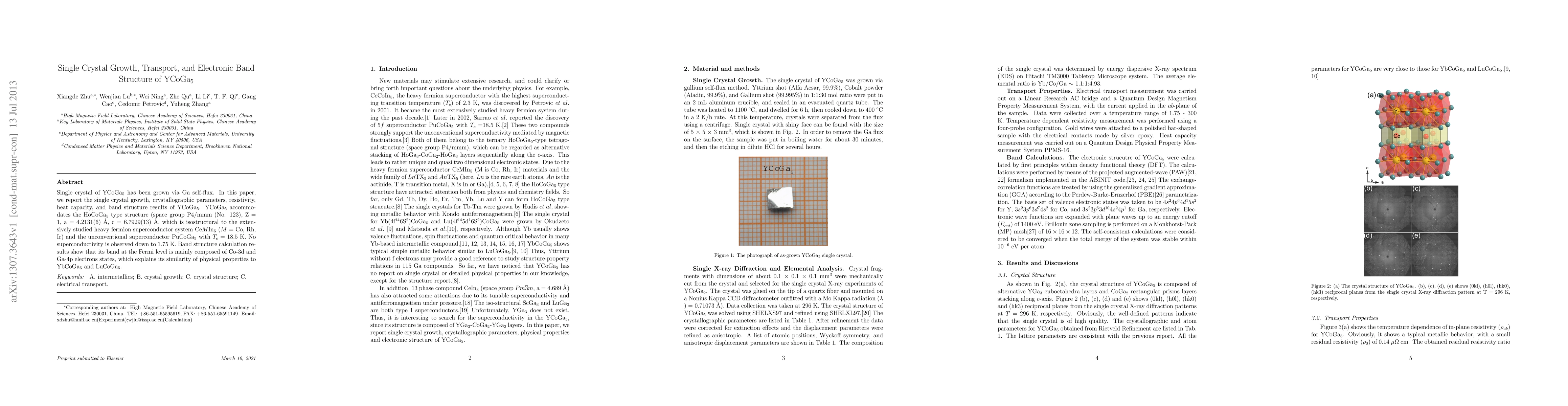 This paper reports the growth of YCoGa5 single crystals using Ga self-flux, detailing crystallographic properties, resistivity, and heat capacity. The compound exhibits no superconductivity down to 1.75 K, with band structure calculations indicating Co-3d and Ga-4p states at the Fermi level.