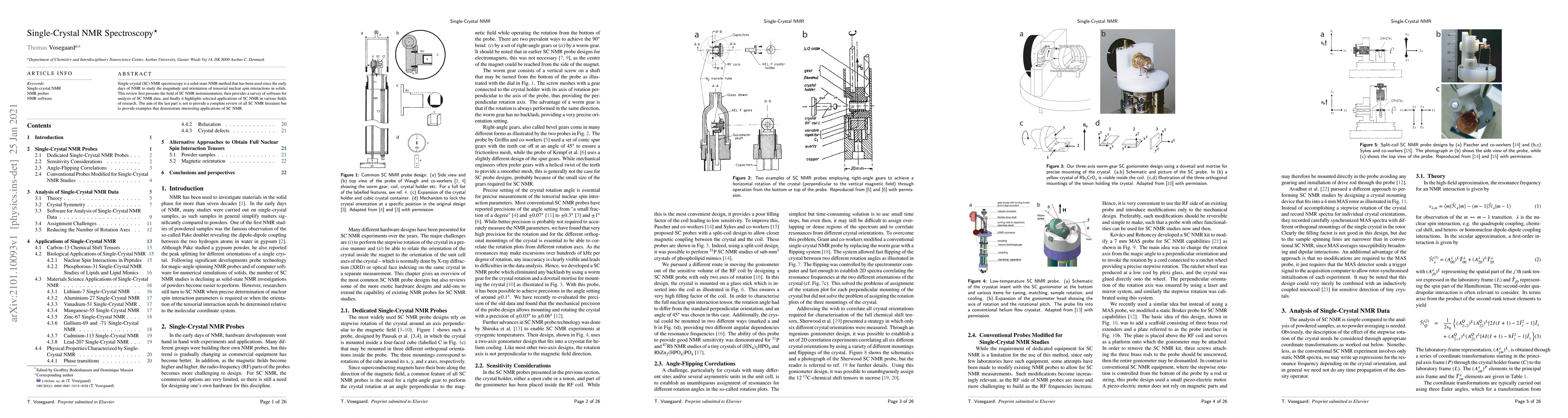 Single-crystal NMR spectroscopy is a solid-state NMR technique used to study tensorial nuclear spin interactions in solids. This review covers SC NMR instrumentation, data analysis software, and highlights selected applications across various research fields.